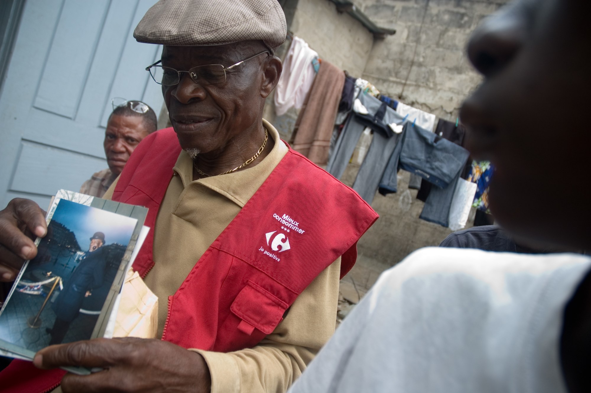 Lamame dressed in his daily clothes (beije shirt and red Carrefour gilet), proudly showing some photos of himself in Paris. Lalame, known as 'the old' or 'the Parisian' has a particular passion for Paris, as many Sapeurs do, and has visited the city many times as part of his family is settled there. Very close friend of Kvv, he is particularly well known and respected in Bacongo, where he is sometimes paid to attend weddings or funerals. Brazzaville, Congo (2007)