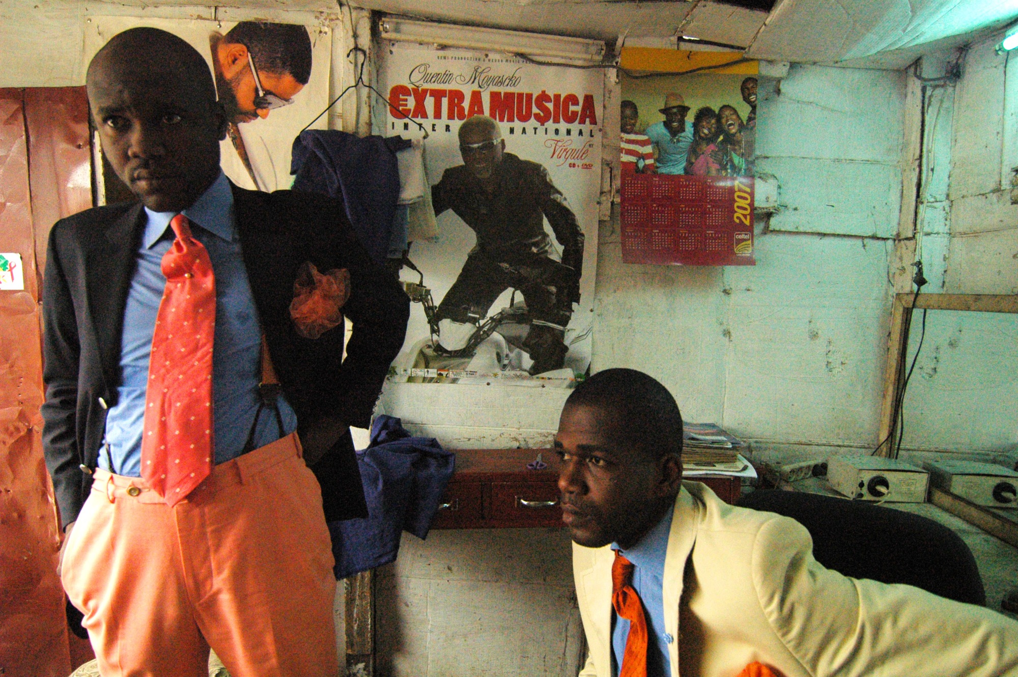 Salvador Hassan and Phael in a room. Behind them a poster of Quentin Moyascko 'Extra Musica' and a 2007 calendar. Brazzaville, Congo (2007)