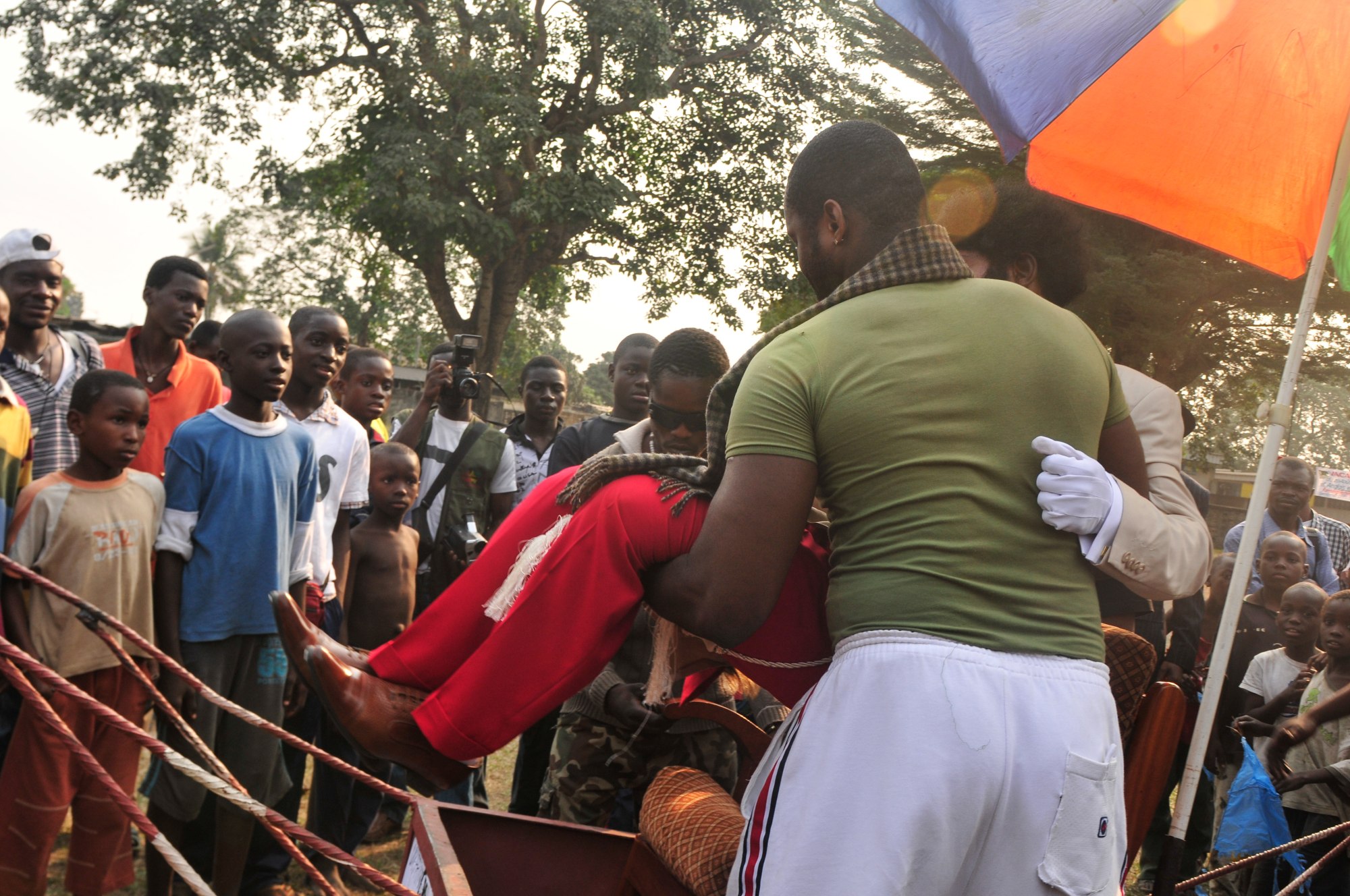 A Sapeur being placed on the charriot-throne of the 'Prince of Congo', surrounded by a watching crowd. Brazzaville, Congo (2008)