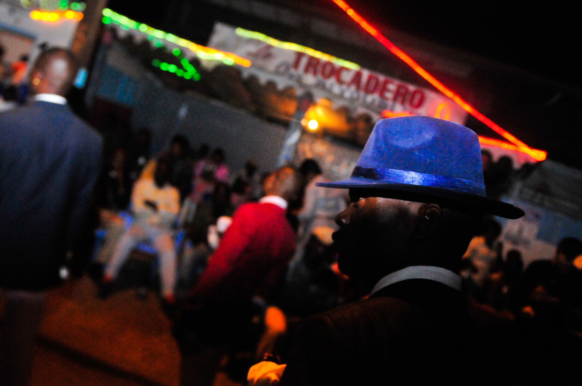 Night scene with a man on the forefront wearing a blue hat, in front of the club Trocadero in Avenue Matsoua. The Trocadero is one of the most popular clubs of Brazzaville. Congo (2008)