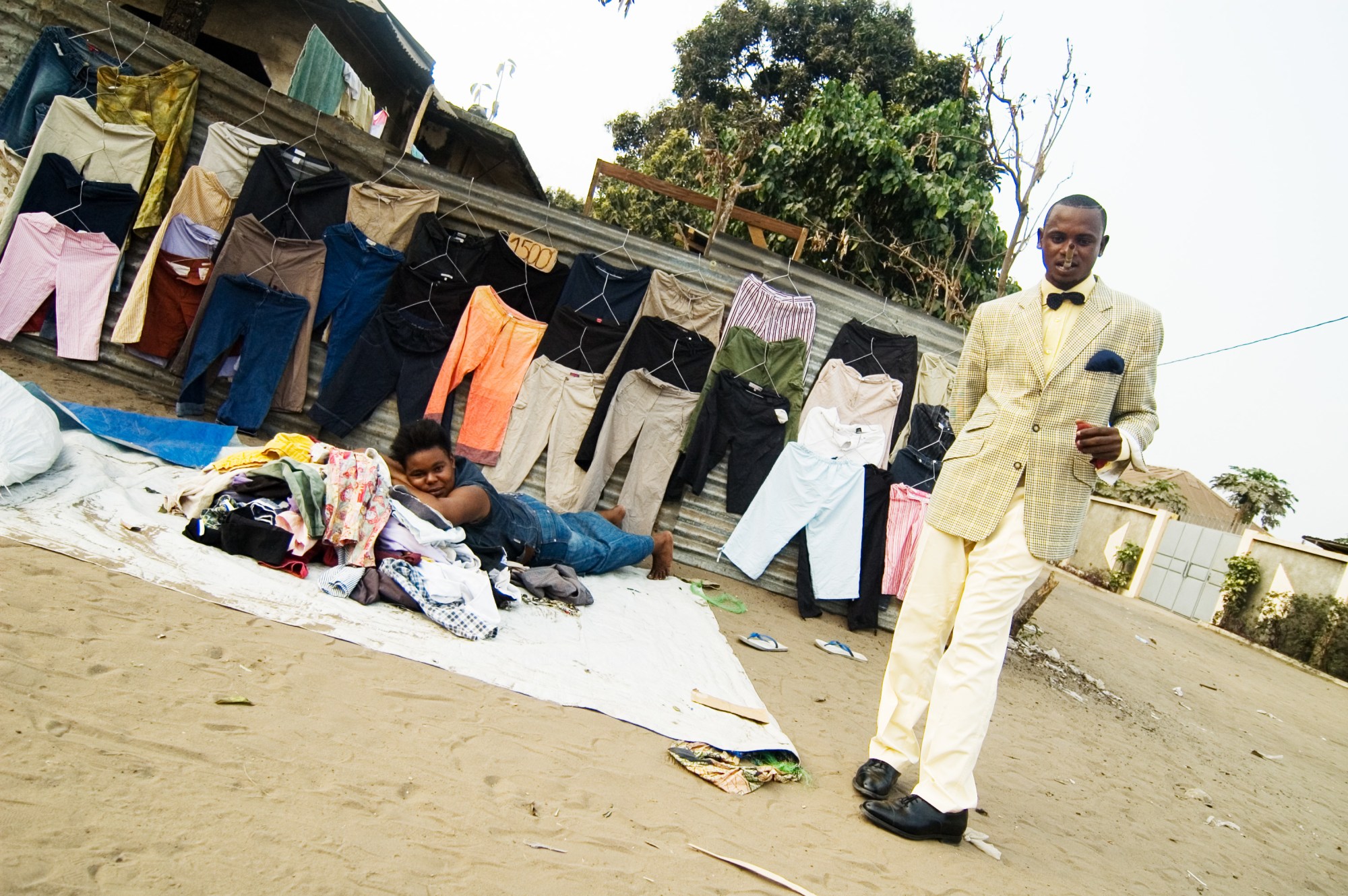 Lalhande posing for the camera on the streets of Brazzaville, standing before a clothes stall. Brazzaville, Congo (2007)