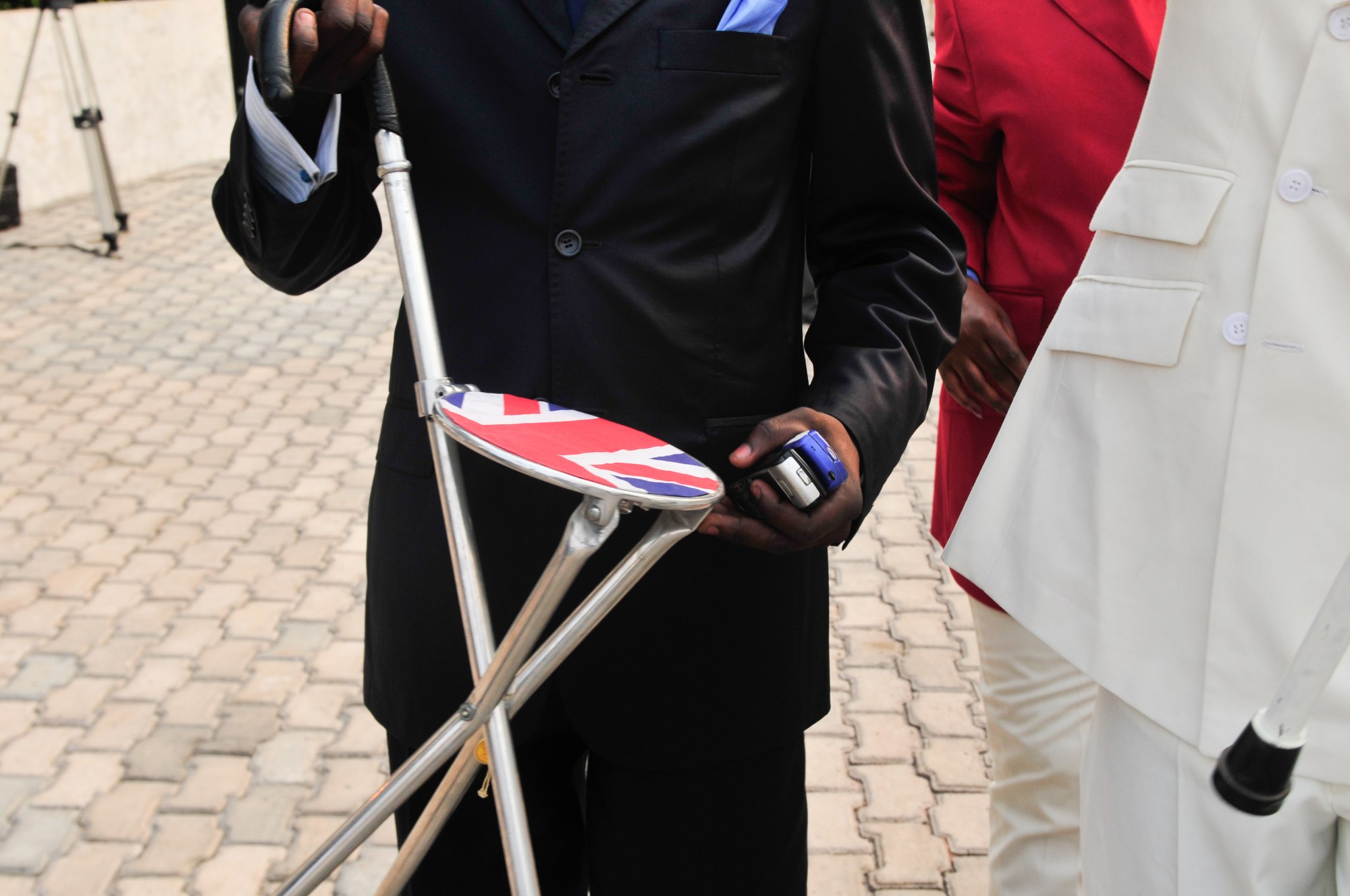 Sapeur showing his walking stick, which is also a retractable portable chair with the union jack printed on its seat. Brazzaville, Congo (2008)
