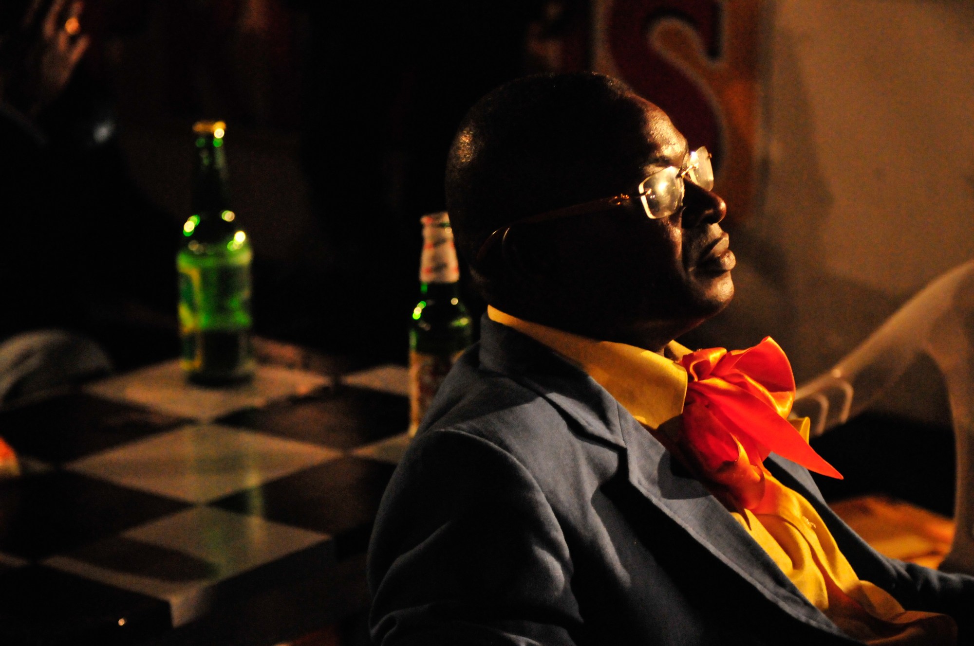 Man sitting sideways at a nightclub wearing a red bowtie and a blue jacket. Brazzaville, Congo (2008)
