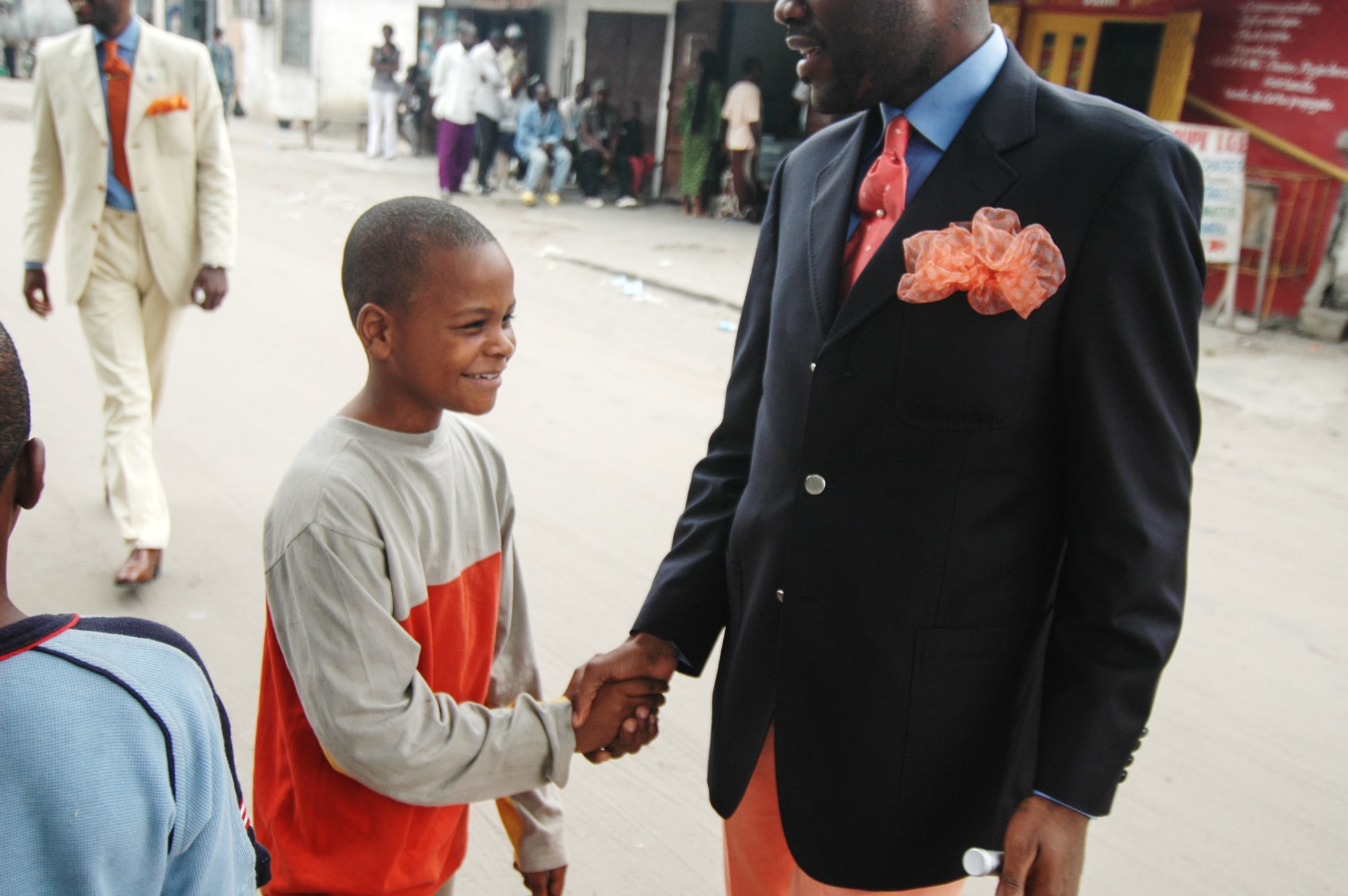 Salvador Hassan shaking hands with a kid in the Poto Poto district of Bazzaville, Congo. (2007)