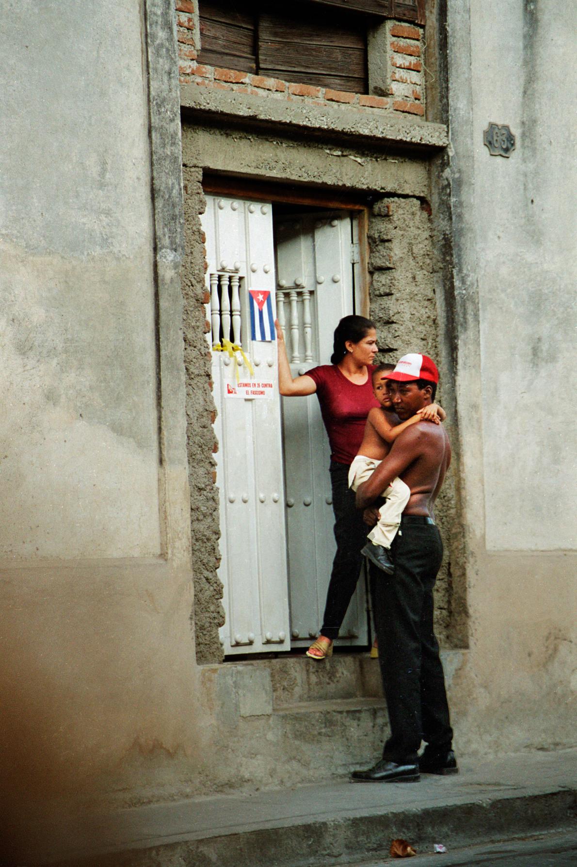 Tamagni travelled to Cuba for the first time in 2003, where he shot his very first rolls of film. Unearthed and digitalised by the Daniele Tamagni Foundation in 2022, these photographs mark the beginning of Daniele's love of photography, showing the seeds of what would become his distinctive approach to photographing communities around the world. La Havana, Cuba, 2004. A man holds a child in the street. Behind him, a woman in the doorway.