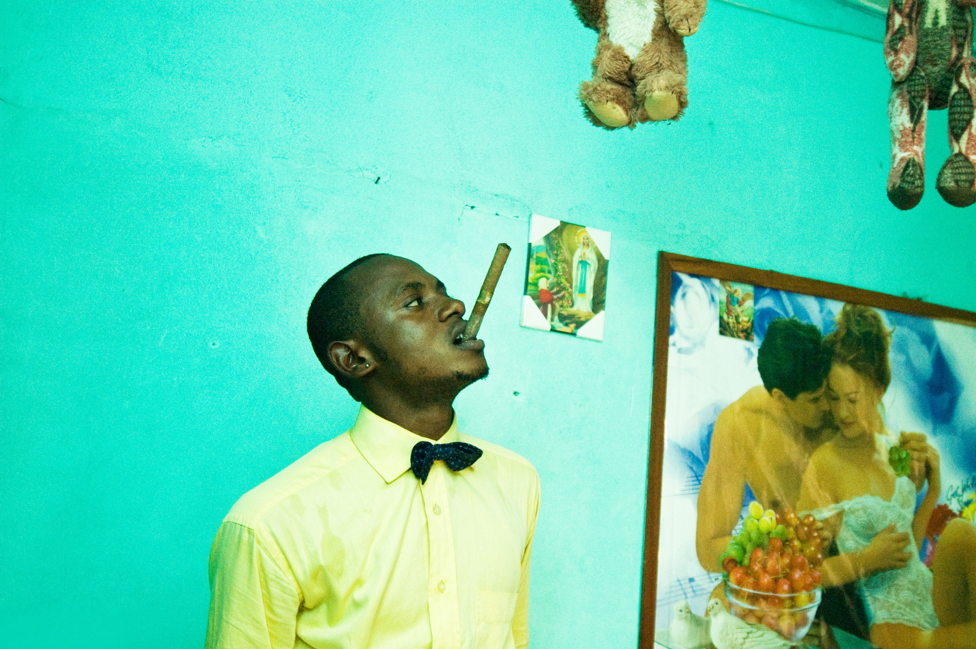 Lalhande in his room wearing a yellow shirt and a blue bowtie, biting a cigar. The background wall is light blue, hanging on it an icon of the Virgin Mary and an erotic poster with a caucasian couple. Brazzaville, Congo (2007)