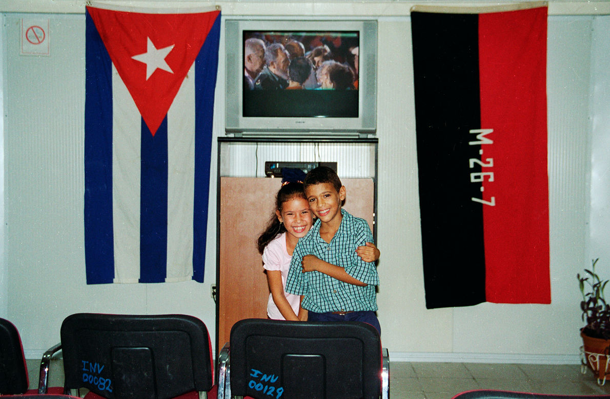 Tamagni travelled to Cuba for the first time in 2003, where he shot his very first rolls of film. Unearthed and digitalised by the Daniele Tamagni Foundation in 2022, these photographs mark the beginning of Daniele's love of photography, showing the seeds of what would become his distinctive approach to photographing communities around the world. La Havana, Cuba, 2003. Two children smile for the picture. In the background a cuban and 26 of July Movement flag.
