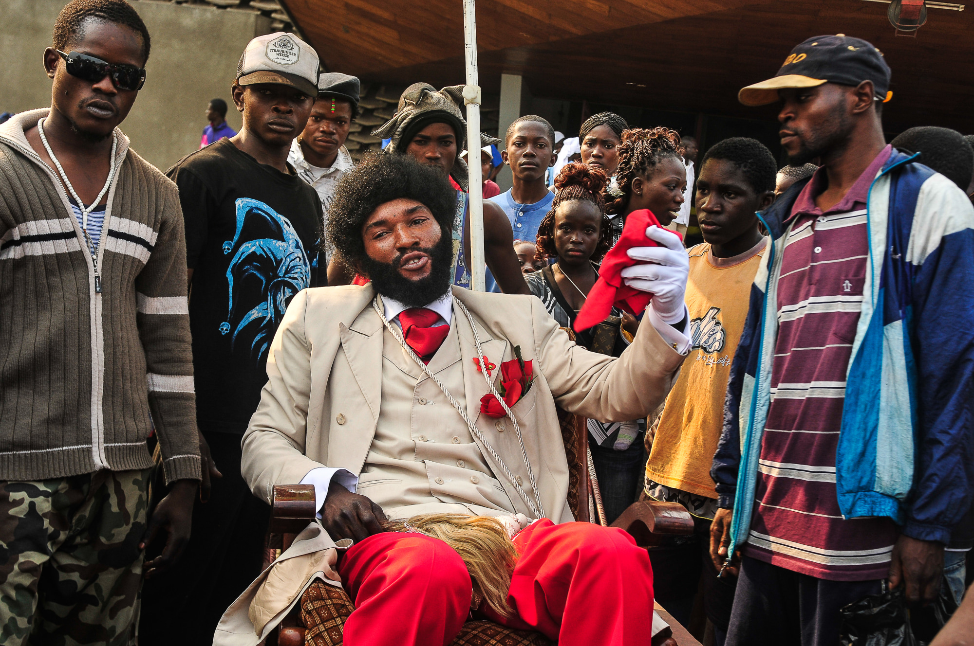 The 'Prince of Congo' sitting on his charriot-throne, surrounded by a crowd. He is wearing red trousers and matching tie and pocket handkerchief, beije jacket and white gloves. Brazzaville, Congo (2008)