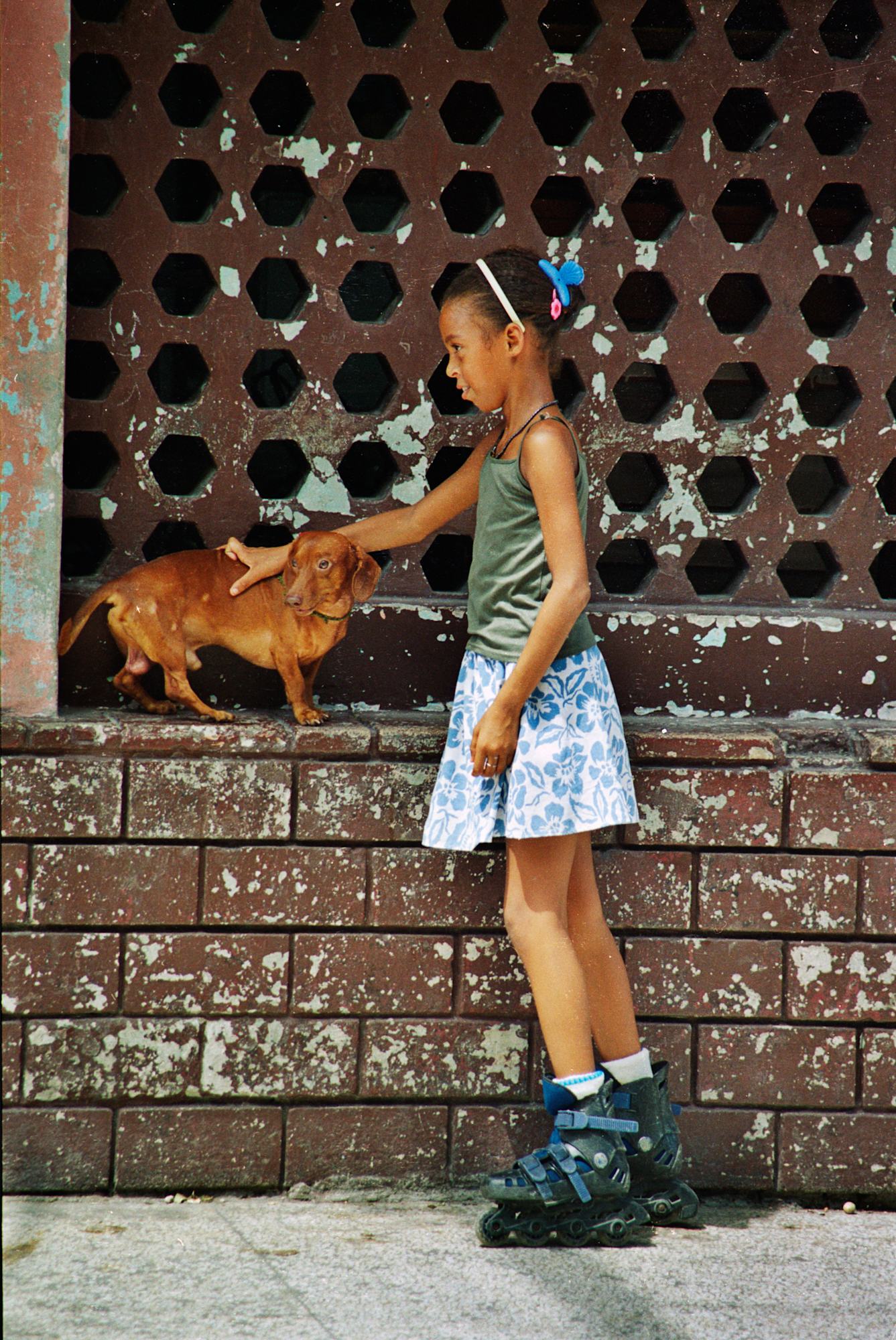 Tamagni travelled to Cuba for the first time in 2003, where he shot his very first rolls of film. Unearthed and digitalised by the Daniele Tamagni Foundation in 2022, these photographs mark the beginning of Daniele's love of photography, showing the seeds of what would become his distinctive approach to photographing communities around the world. La Havana, Cuba, 2004. A child on roller skates pets a dog on a ledge.