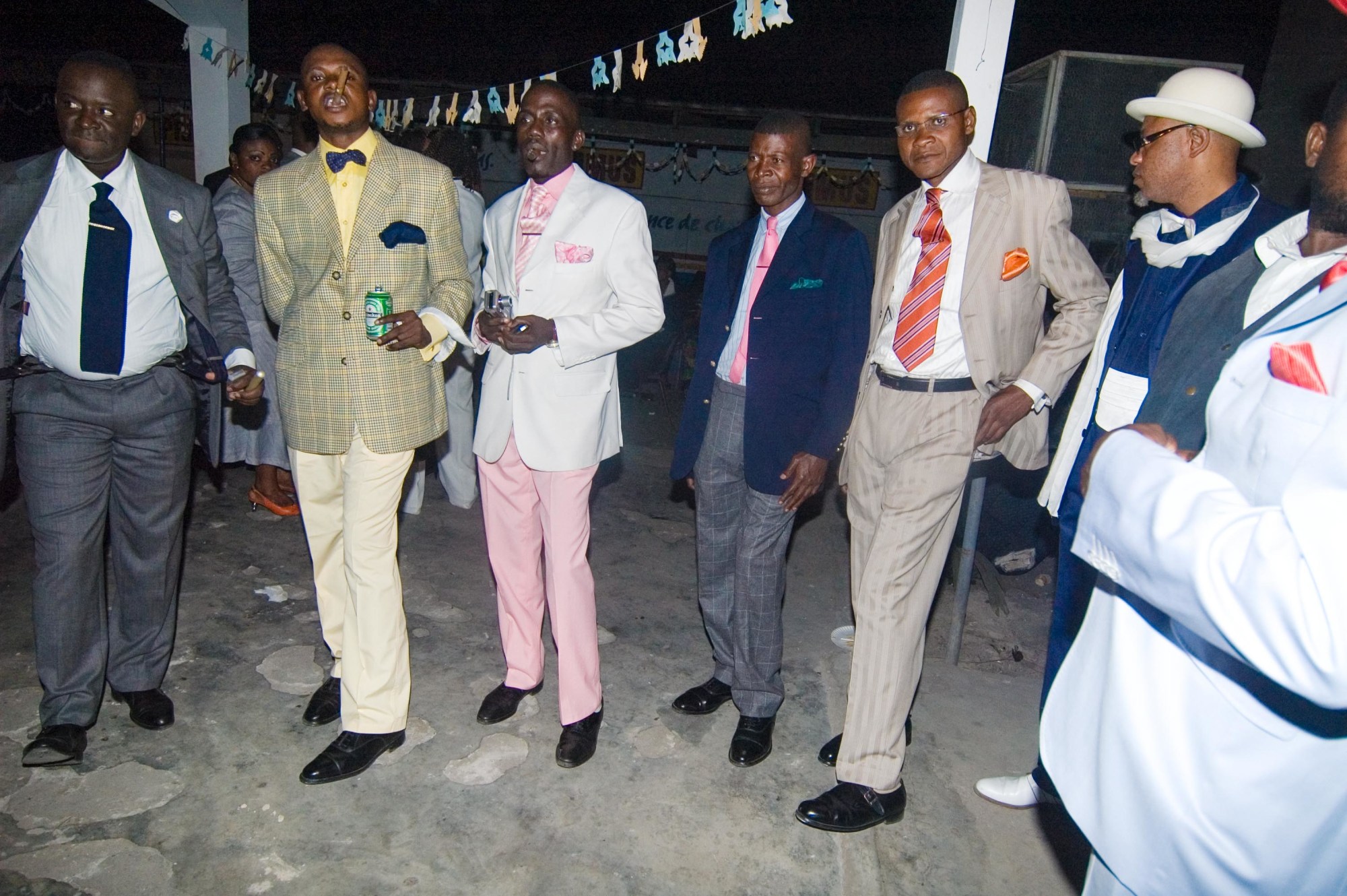 Unpublished photograph of a group of Sapeurs at the nightclub Main Bleu, with Lalhande (second from the left) and Kvv Mouzieto (second from the right). Brazzaville, Congo (2007)
