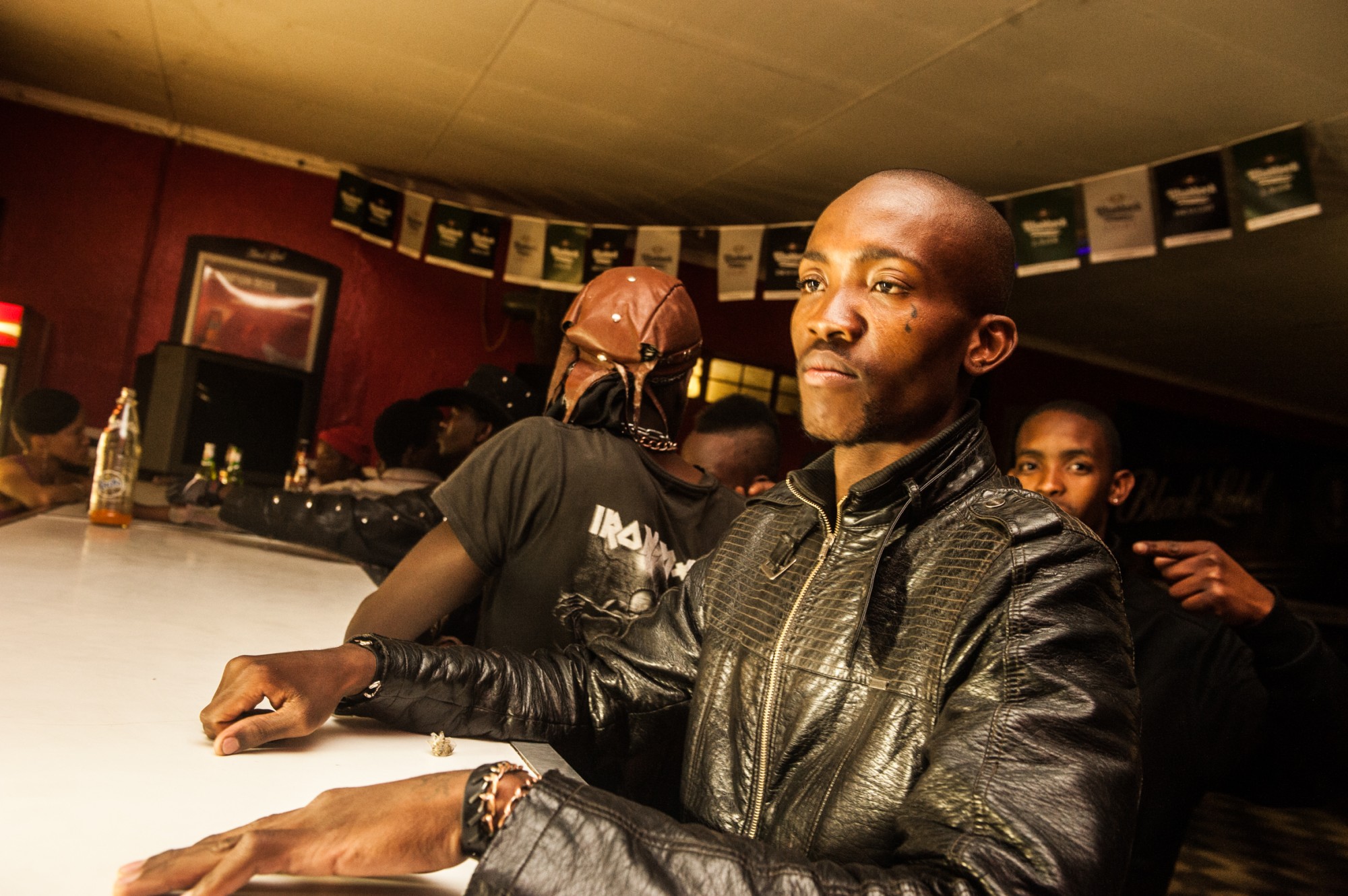 A man sitting at the counter of a bar with two teardrops tattooed under his eye.
