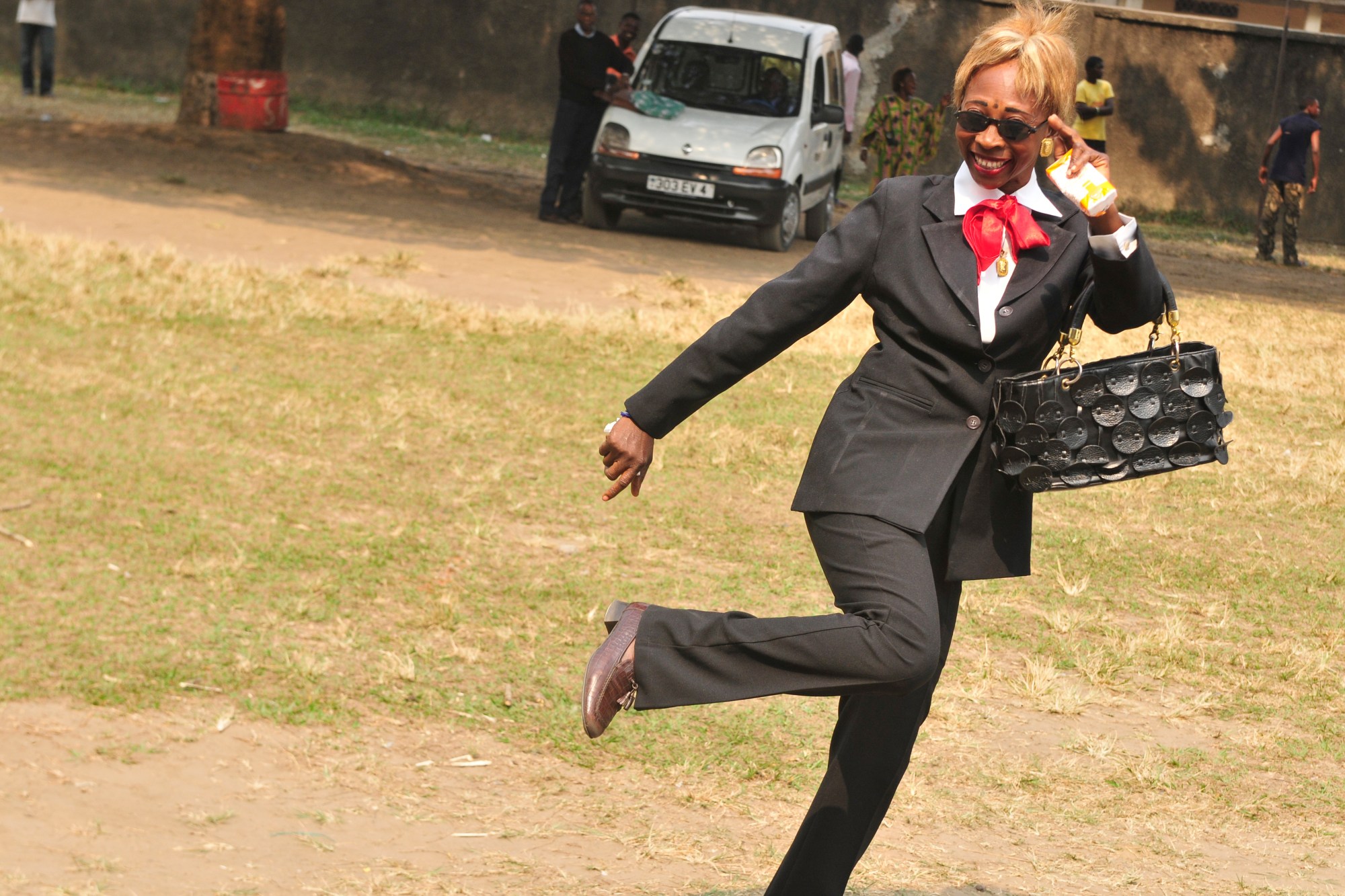 A woman Sapeur performing for the camera. The culture of Sape is predominantely male, especially in Congo, where women are tied to traditions by which they fears to be poorly seen if adhering to the fashion of Sapeurs. Brazzaville, Congo (2008)