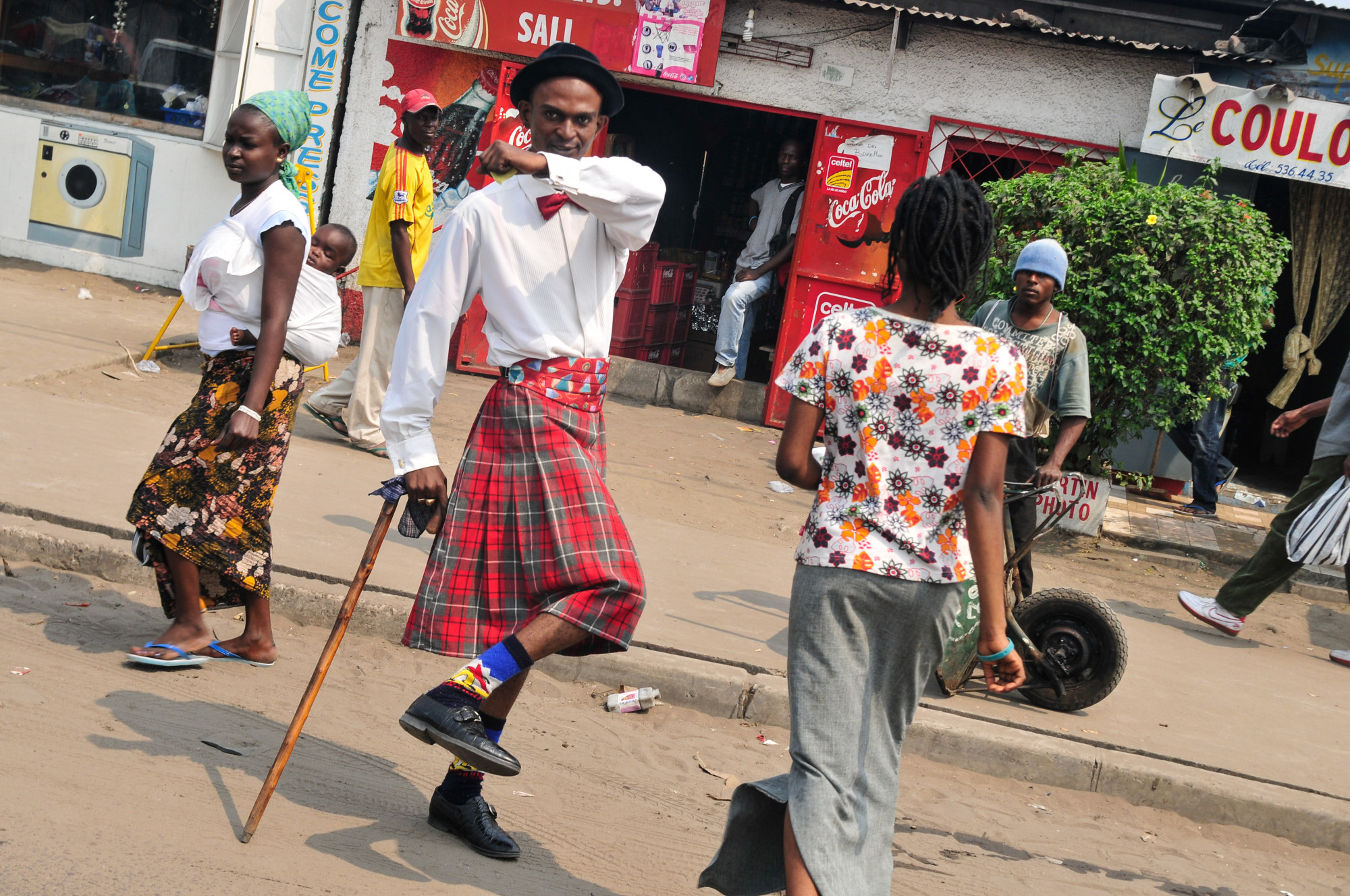 Sapeur in red kilt skirt posing for the camera on the street, wearing a black bowler hat, red bowtie, white shirt, black leather shoes, walking stick and blue socks. Brazzaville, Congo (2008)