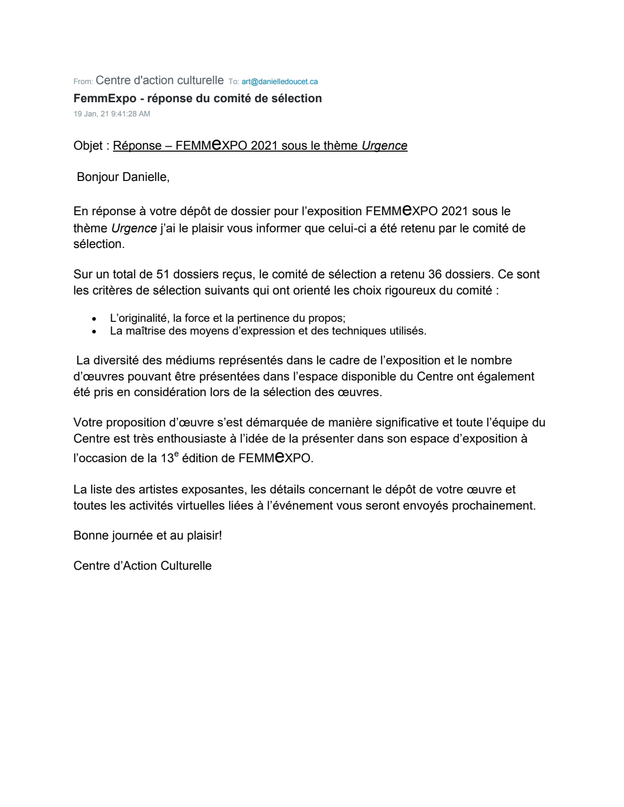 L'œuvre « Empreinte » soit choisie pour représenter la 13e édition de l’exposition Femmexpo, Centre d'Action Culturelle, situé à Montebello.