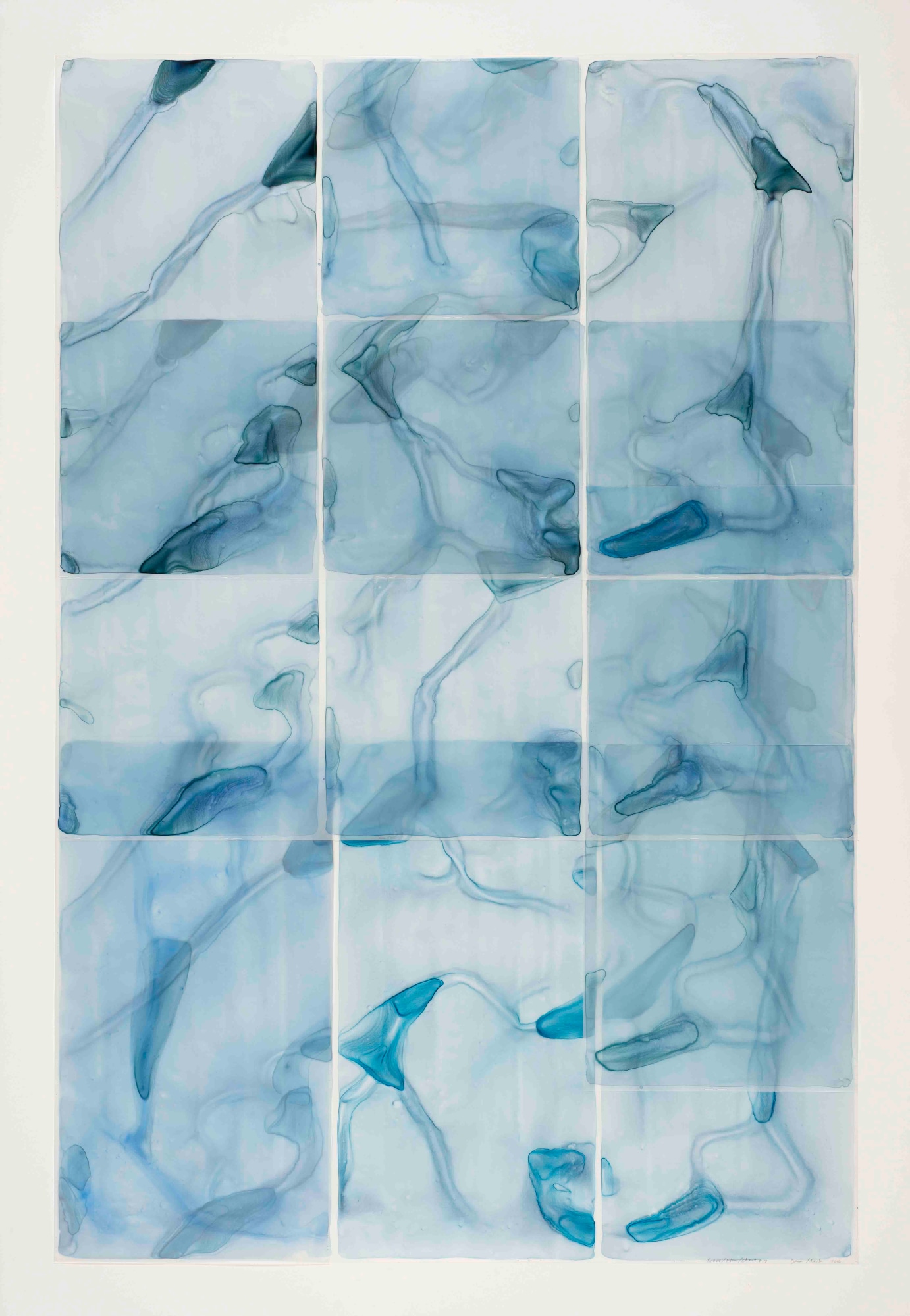 watercolor on layered translucent Yupo paper sewn to acid-free mat and framed in white-painted wood frame