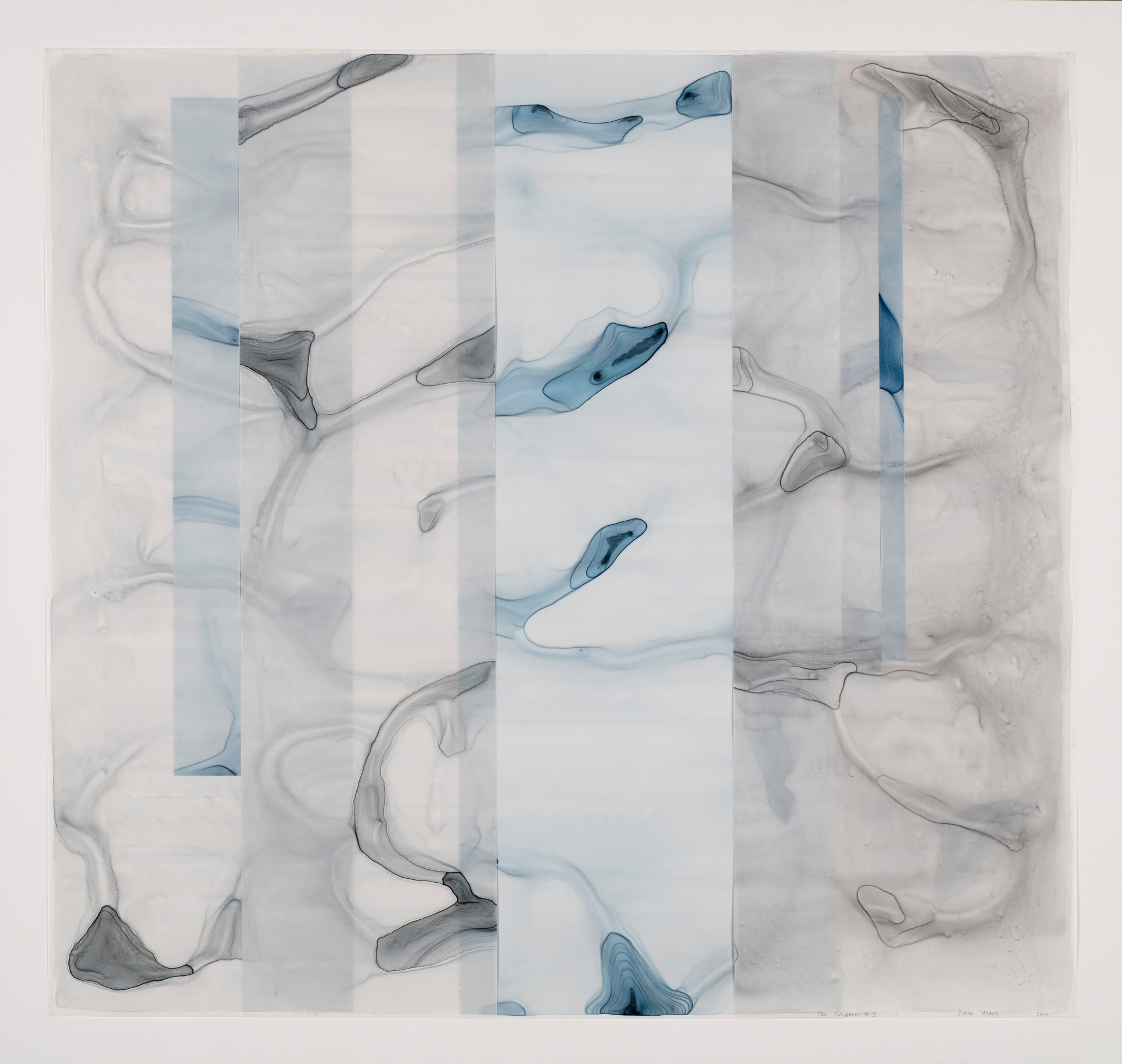 watercolor on layered translucent Yupo paper sewn to acid-free mat and framed in white-painted wood frame