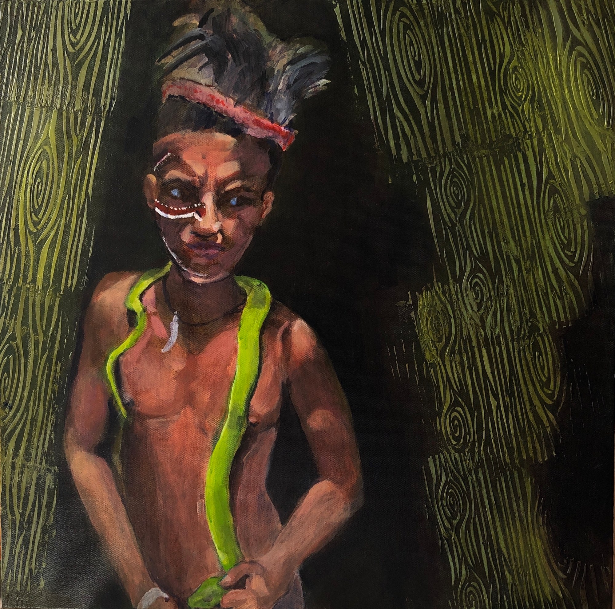 I took a photo in Alotau, Papua New Guinea, of a teenage boy dressed in native costume with his pet Green Tree Python draped around his neck. I asked him where he got it & he said, “I caught it.” @How did you catch it?”, I asked. I was astonished when he replied, “I caught it with my hands.” He didn’t look happy dressed as he was with his pet as the main attraction.