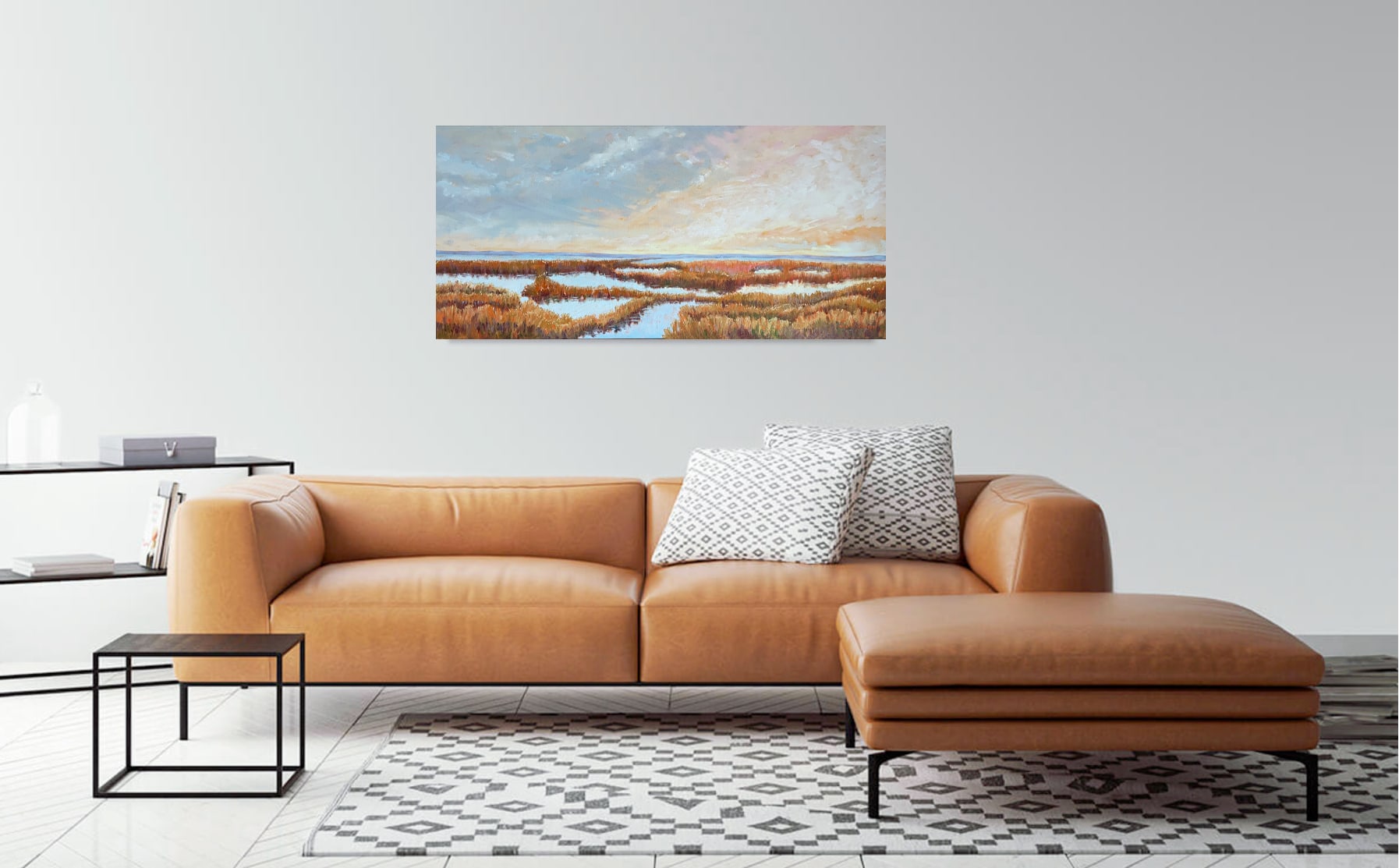 Tidal reeds with water and hills in the background. Gallery wrapped.