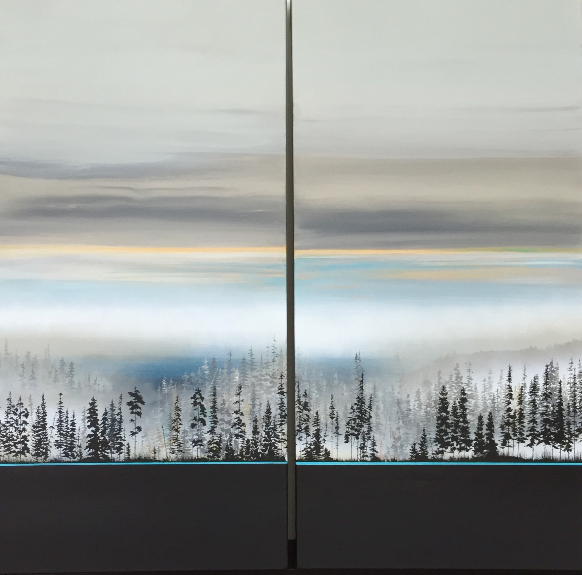 "Misty Horizon West and East" are acrylic paintings on high quality heavy cotton canvas with 1 1/2" museum wrapped painted edges. They are a matched pair that can be displayed together or on separate walls. The price listed is for purchasing the pair.