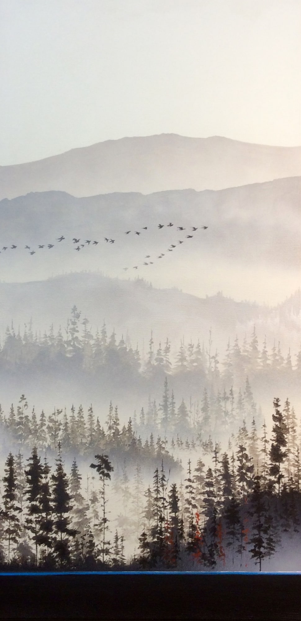Last year's most popular interior design color, Silver Sage, creates the backdrop for this MISTY MORNING. Tulle fog rises from the moisture in the earth as migrating birds find their way to their next stop.
