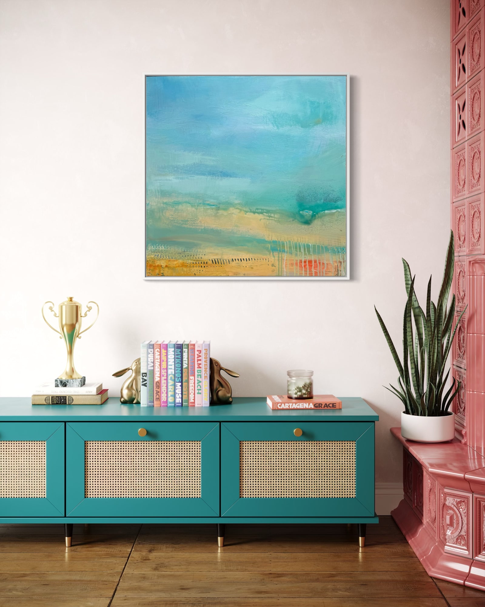 See the sea, is an 80cm square acrylic painting on a wooden board. In this work, I wanted to explore the expansive feeling of a landscape, particularly the tranquil boundary where sky meets land.