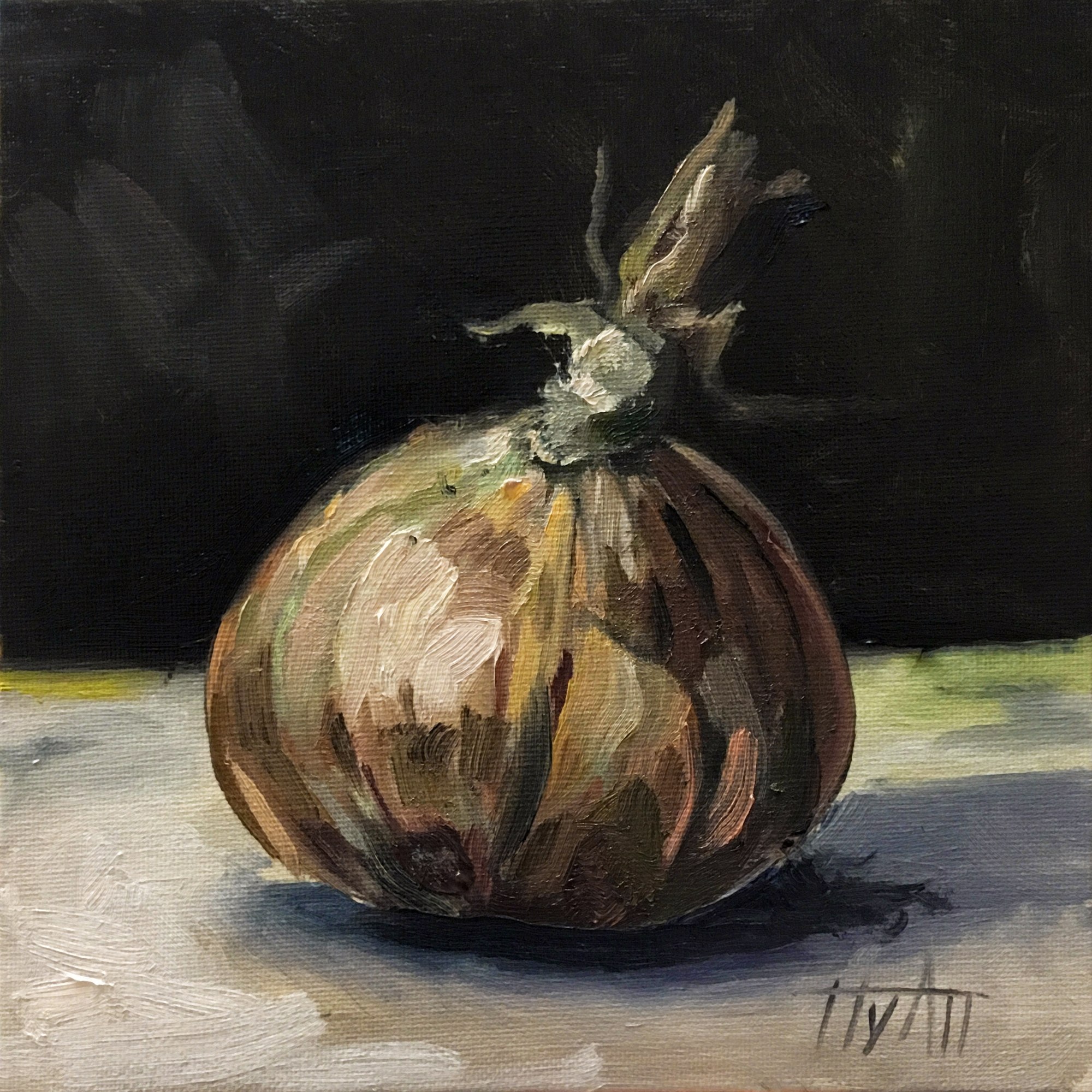 Oil study of yellow onion on dark background.