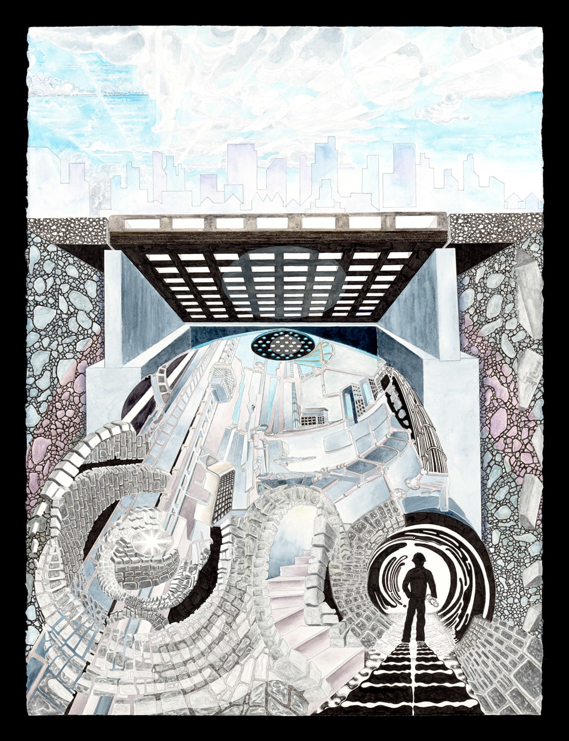 Layer upon layer, each city is built upon the past. In this example the denizens can emerge while bypassing the present and going into a future reality sometime beyond. "Under-city Systems" was designed with shifting figure-ground relationships.