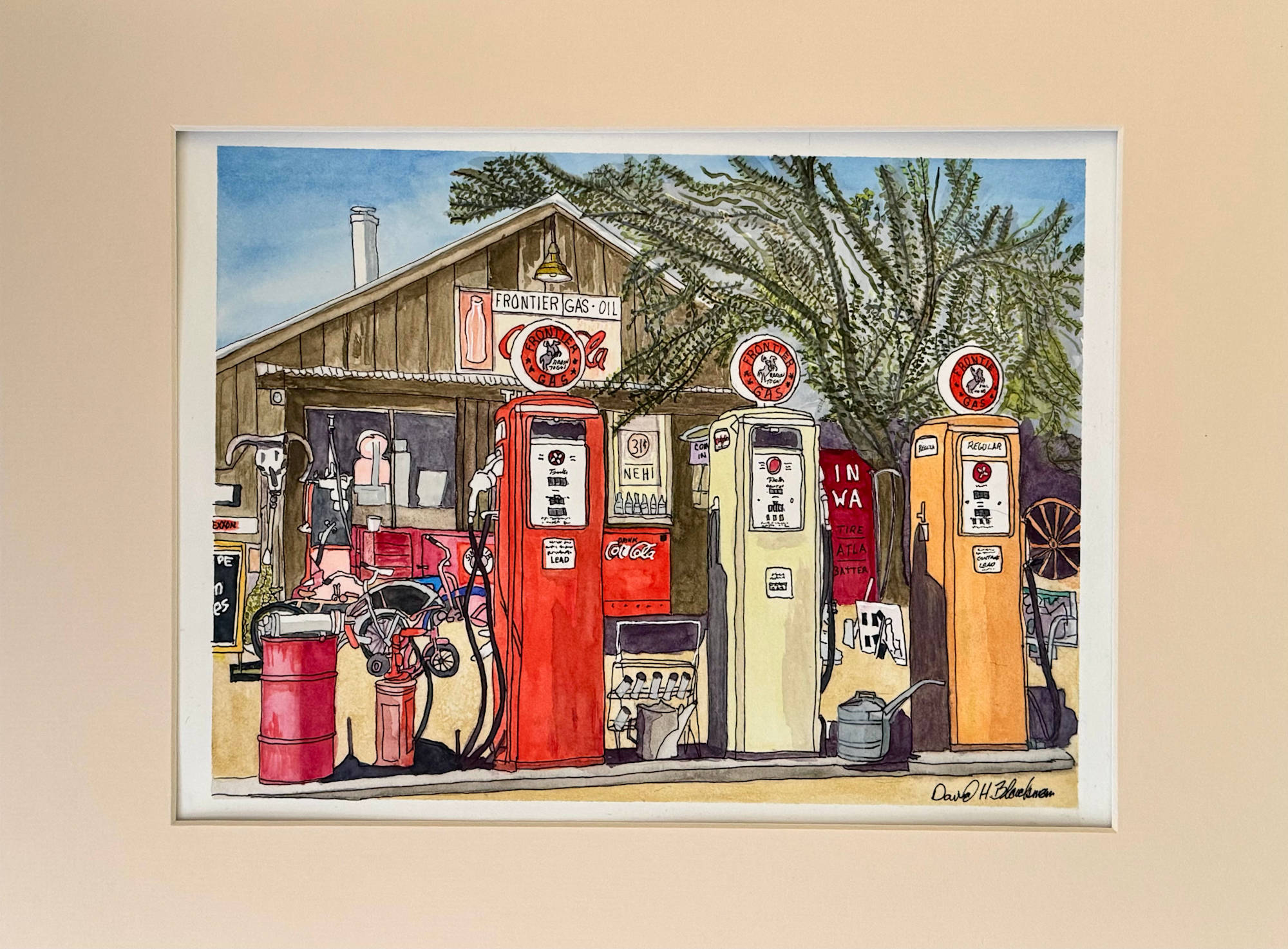 Frontier Pumps in Full Sun presents a quiet moment at a vintage gas station, where three distinct pumps stand in bold shades of red, cream, and orange. The weathered wooden building behind them, marked by a simple “Frontier Gas Oil” sign, anchors the scene with a sense of place and time. Everyday objects—a bicycle leaning nearby, an old Coca-Cola cooler, barrels, and an oil can—populate the setting, suggesting the rhythms of daily life once centered here. Leafless trees stretch behind the structure, framing the scene with a muted natural presence that contrasts the vibrant colors of the pumps. The careful line work and controlled washes capture the intersection of utility and memory, inviting reflection on the landscapes shaped by small, essential businesses along historic roads. This work quietly honors the past without sentimentality, focusing instead on the lived experience tied to these enduring, familiar forms.