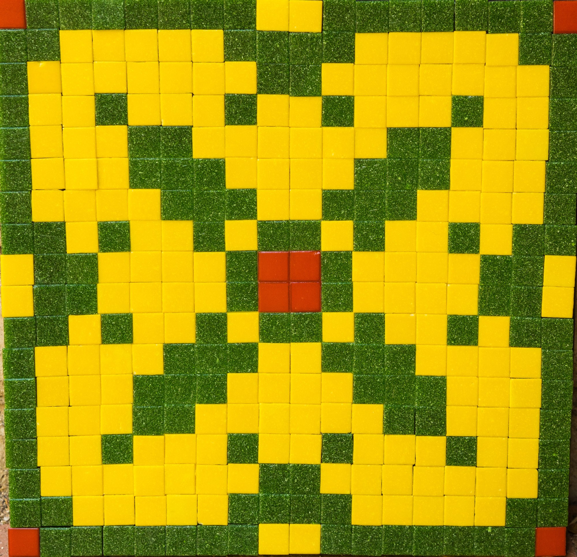 - Subject Matter: X-shaped design in green, yellow, and red