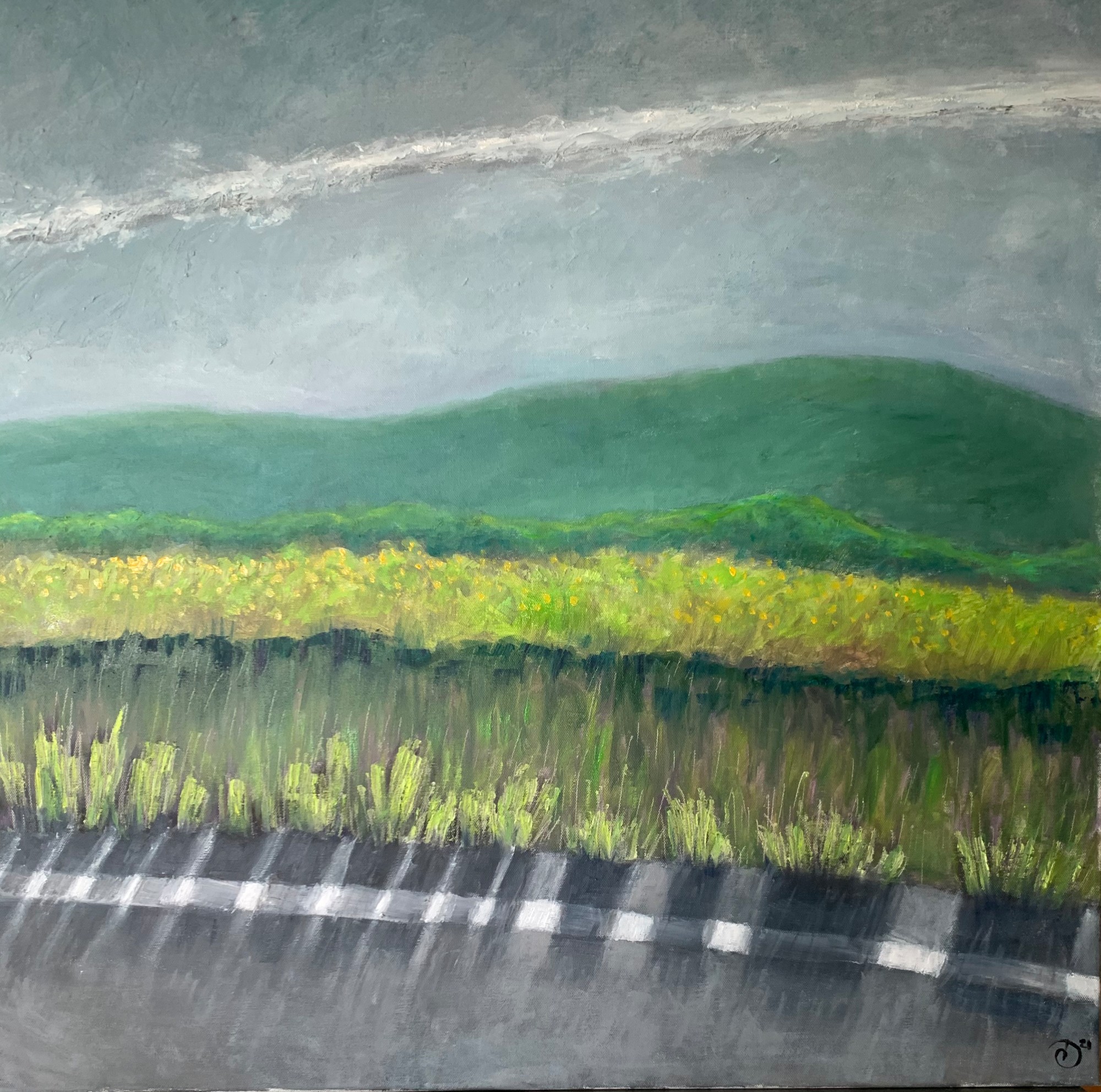 First of two similar paintings with grass casting a shadow across a line on a road. Contrail in the sky.