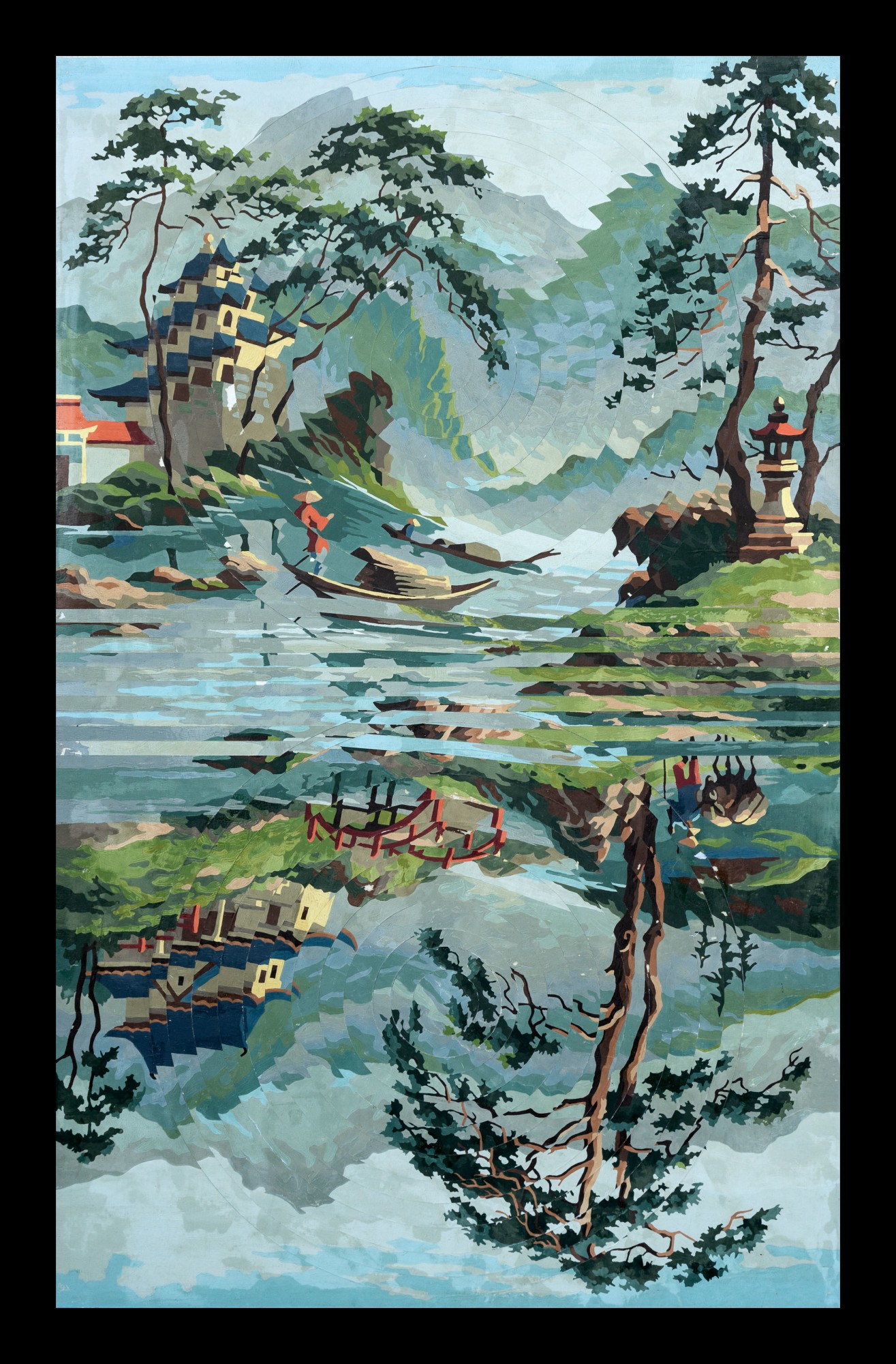 Vintage PBN set of two paintings. Hand manipulated and visually stitched together creating the initial illusion of a reflected landscape.