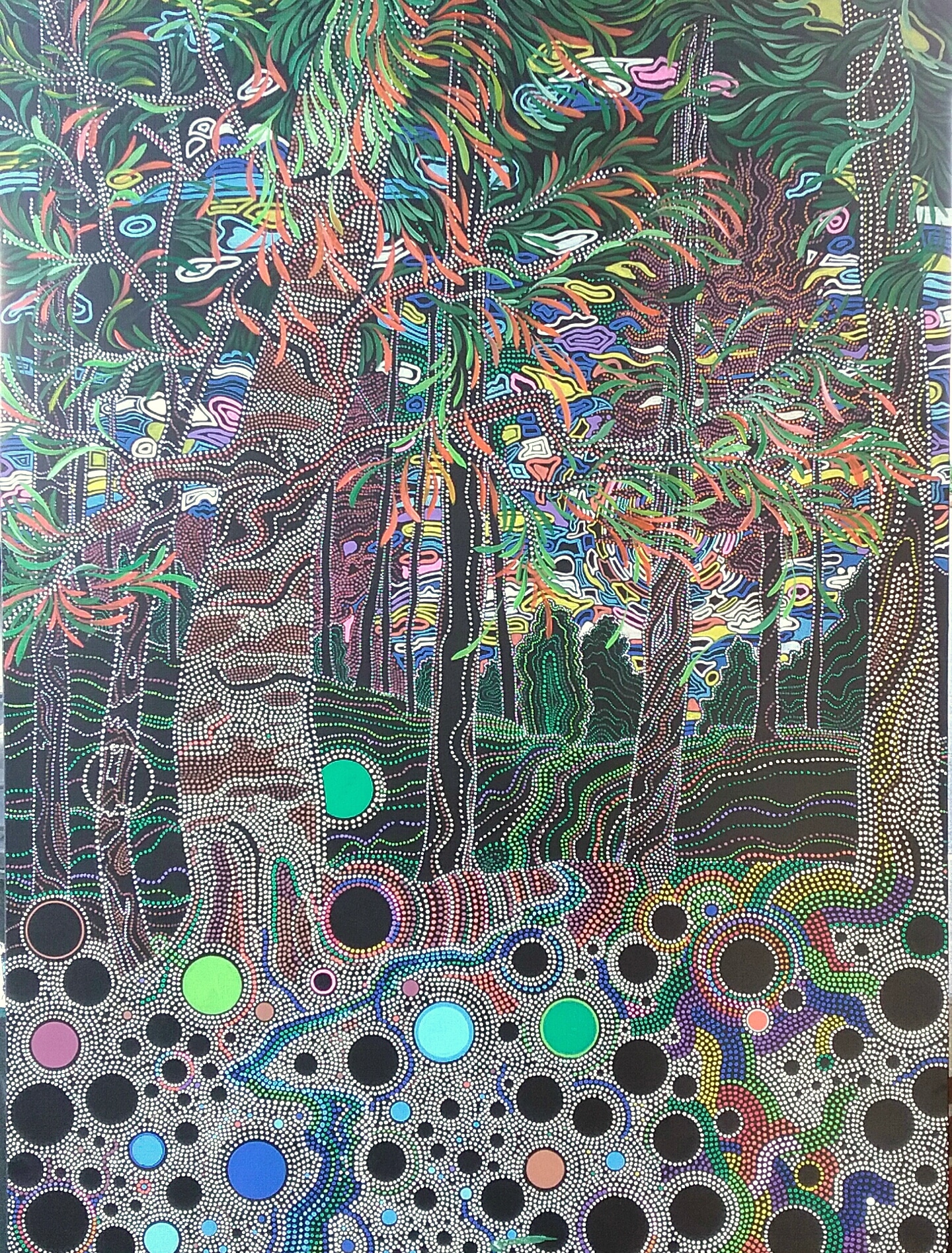 This is a very colorful painting showing different techniques learned and developed by the artist.