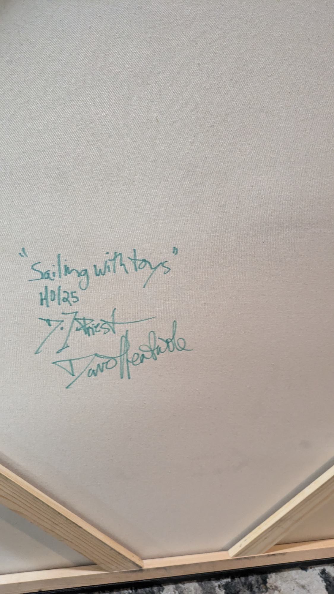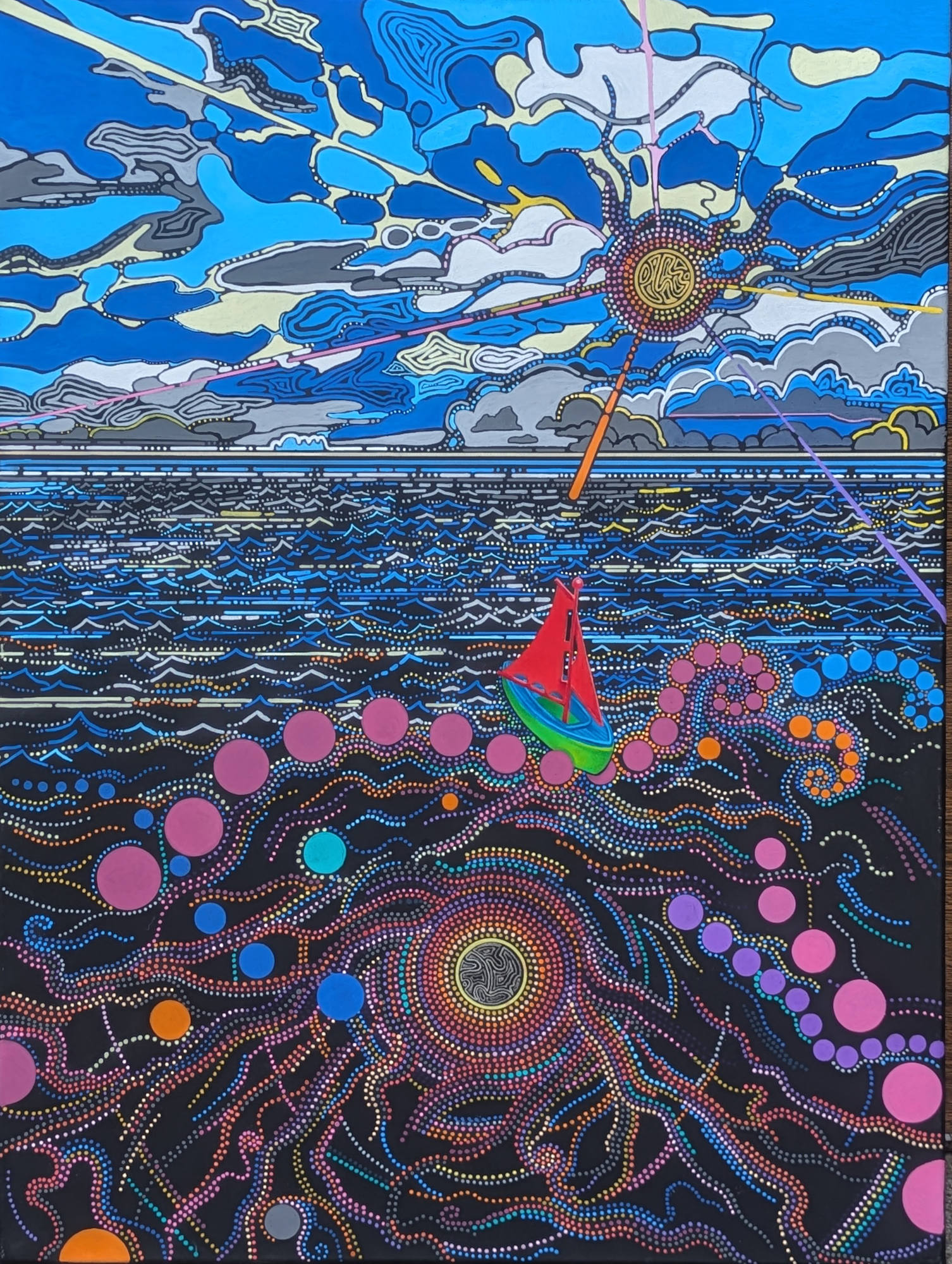 In Sailing with Toys, Heatwole merges childhood nostalgia with cosmic wonder in a vivid, pointillist dreamscape. A bright red toy sailboat—reminiscent of one the artist once played with in the bathtub—drifts across stylized waves beneath a swirling, electric sky. Radiant blues and fragmented cloud forms surround a blazing sun that radiates with golden concentric circles and energetic rays, signaling an awakening or disruption. Below the surface, the ocean gives way to a mysterious world where an abstract octopus, formed of colorful dots and tendrils, emerges from the depths. Its curling limbs connect to luminous orbs, as if reaching for the surface—or perhaps memory itself.