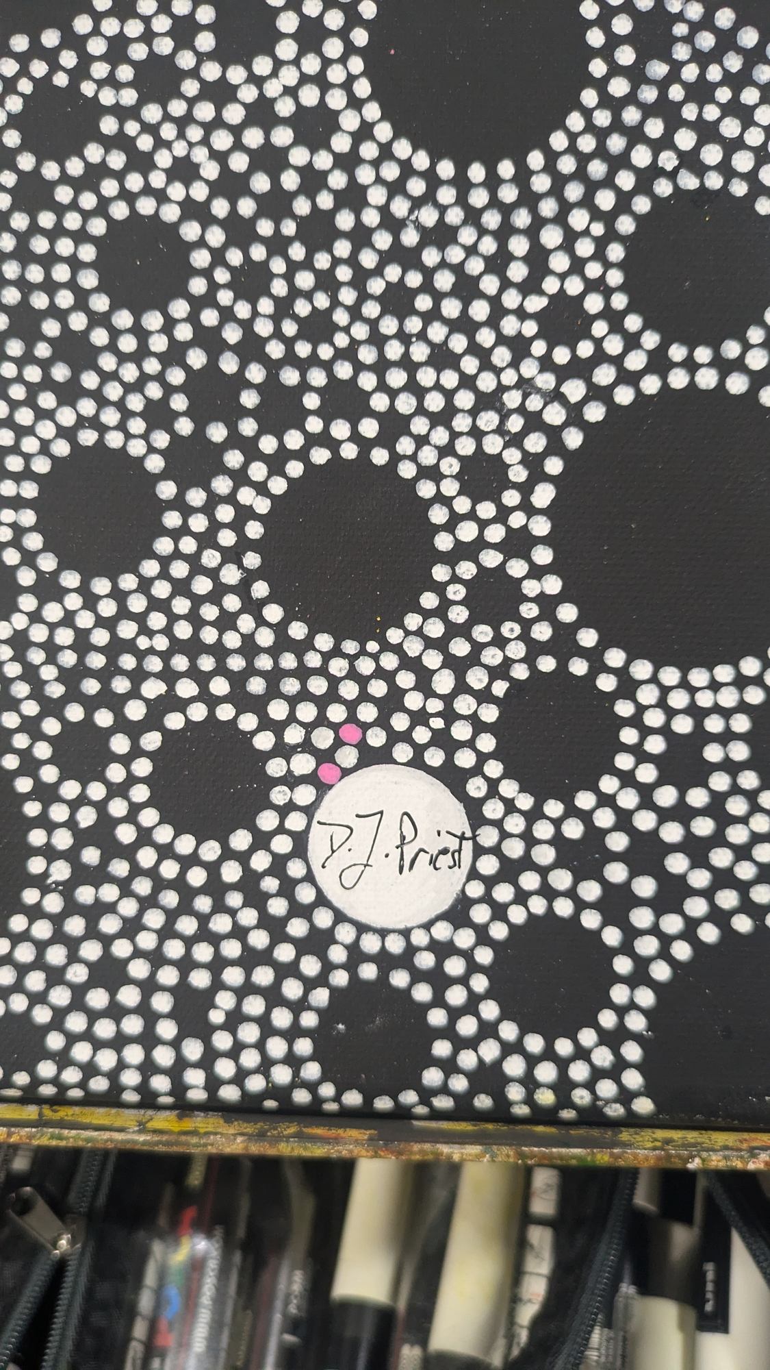 For many years I have studied the art of Aboriginal peoples from different regions of the world. Through this journey of studying and collecting, I have gradually developed my own style—one that resonates strongly with collectors while remaining deeply personal. This work, like many others in this series, is created primarily through the careful placement of dots. Each dot is applied with intention, building patterns that carry rhythm and energy. Of all my artistic explorations, this style is the most meditative in nature. The act of creating these works is both a practice of focus and a pathway into stillness, where each dot becomes part of a greater whole.
