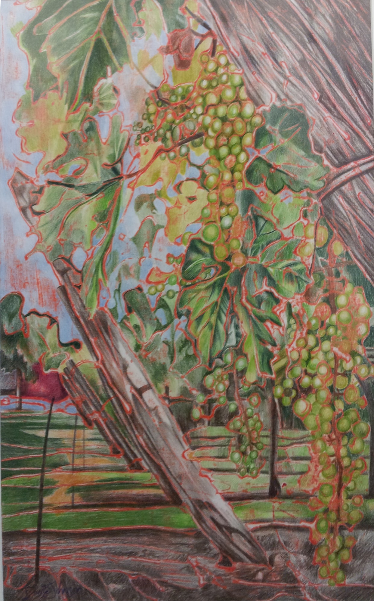 There are many pieces from this particular series (technique and style) and this is one of my very favorite pieces because it is so different from what I usually do. This piece is framed in a simple metal frame but looks great.