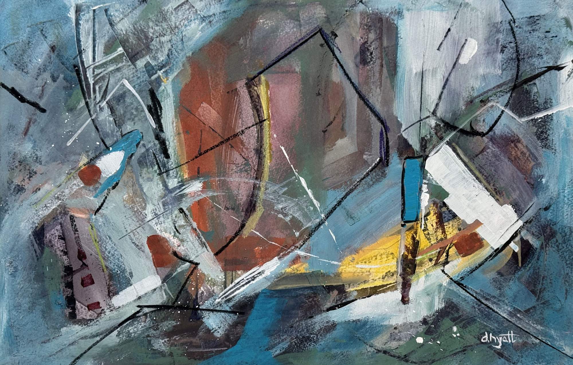 This is a fun piece with a late winter theme - blue maybe giving way to yellow? You tell me. :-) This is a mixed media abstract - oil pastel over acrylic over watercolor!