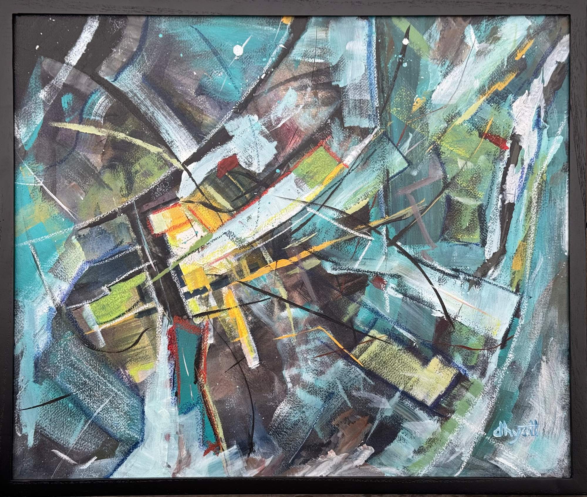 Justantion is is a mixed media piece, with watercolor as a base, accented with acrylic and oil pastels. It is framed without a mat or glass.