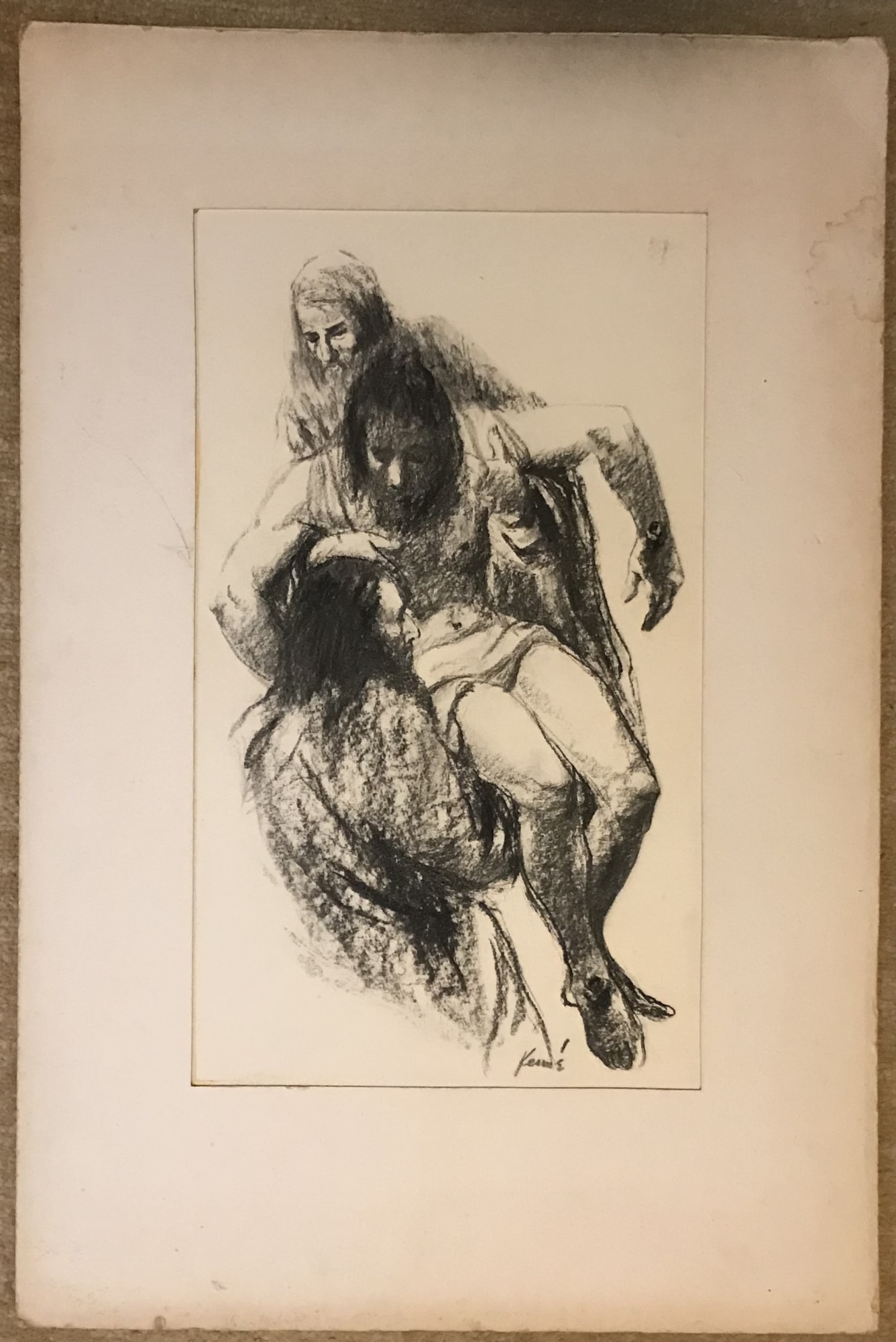 'Jesus' Descent from the Cross' is a charcoal drawing on #80 card stock originally from an estate in Greenwich, Ct. Signed in charcoal lower right.