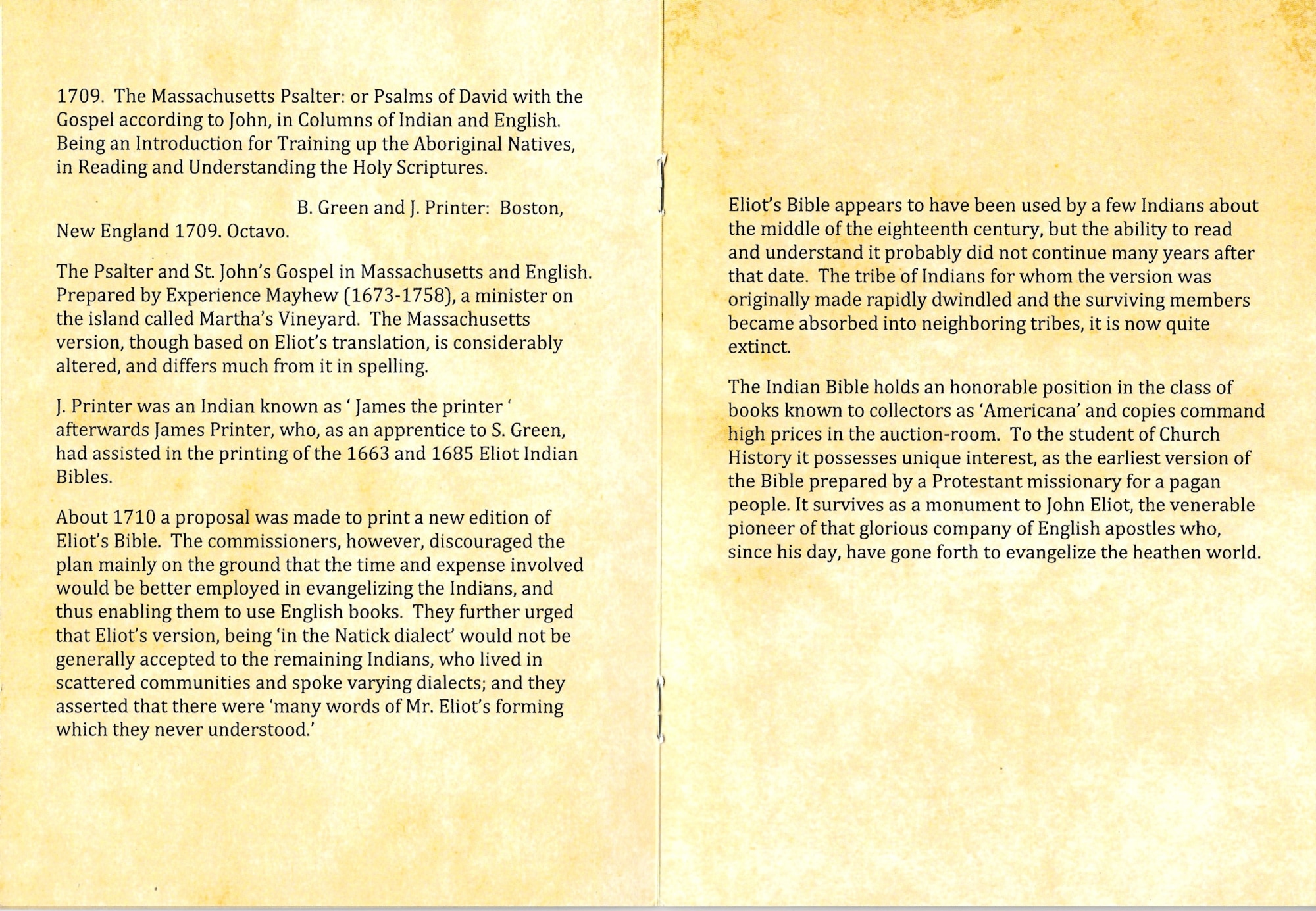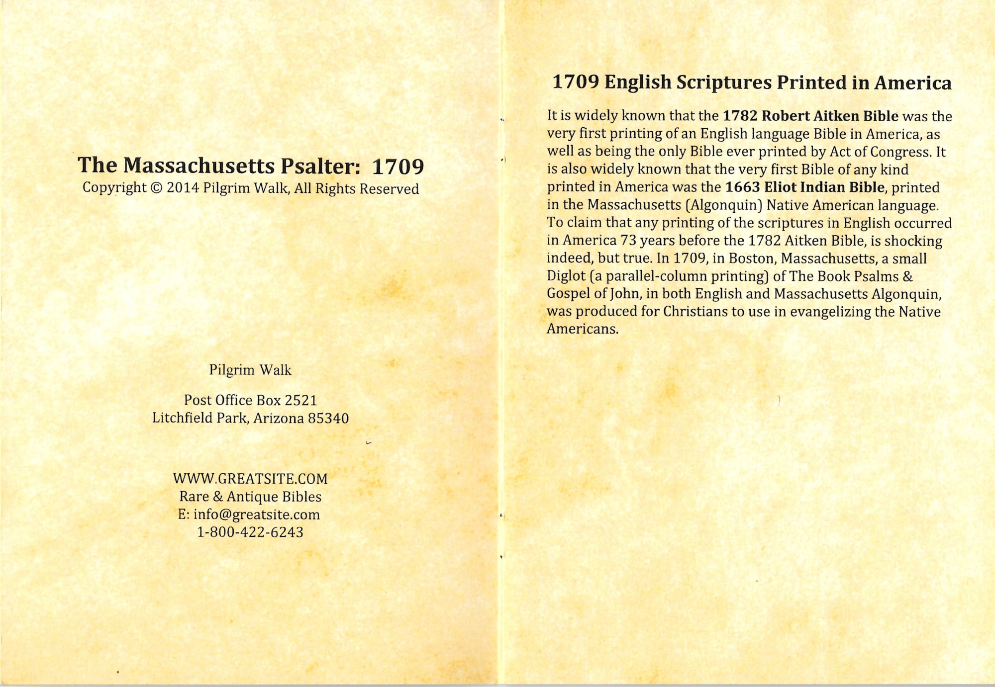 1709 The Massachusetts Psalter leaf: Two Column-Algonquin and English. This Bible was produced for the Christians to use in evangelizing the Native Americans. Housed in a booklet measuring 7.5" x 5.5".