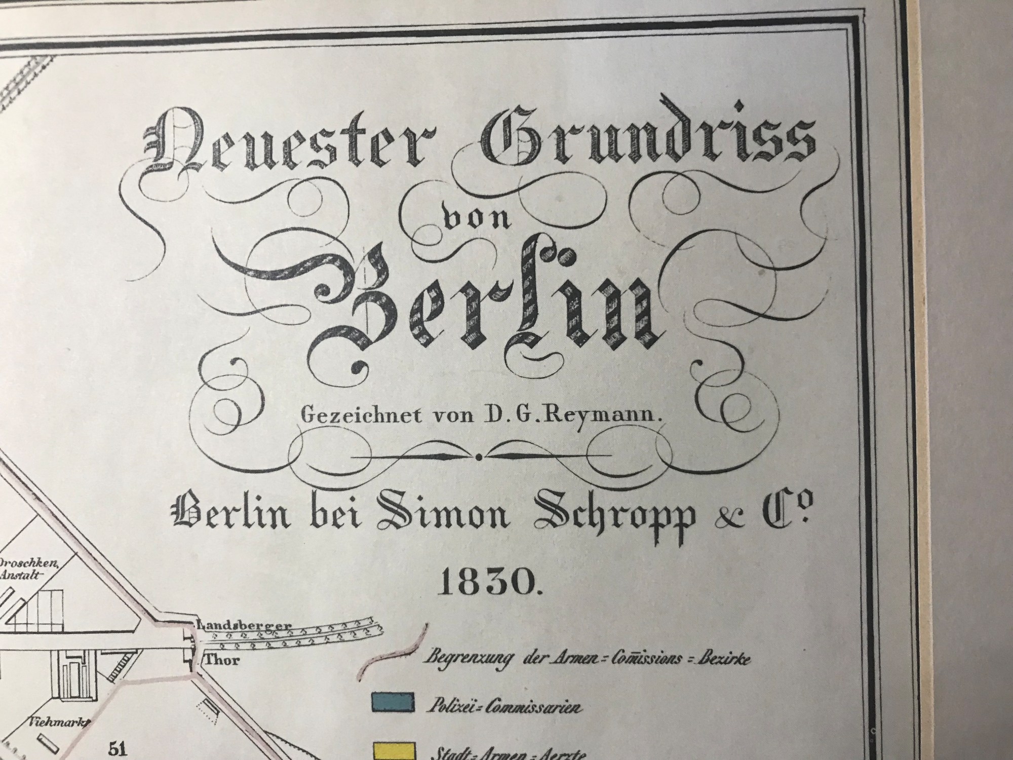 Nicely framed print of the 1830 map of Berlin, Germany drawn by D.G. Reymann and printed by Simon Schropp & Co. originally printed in 1830. Upon opening the frame, the map is adhered to the backing board. This piece came from a high end home in Ridgefield, Ct.