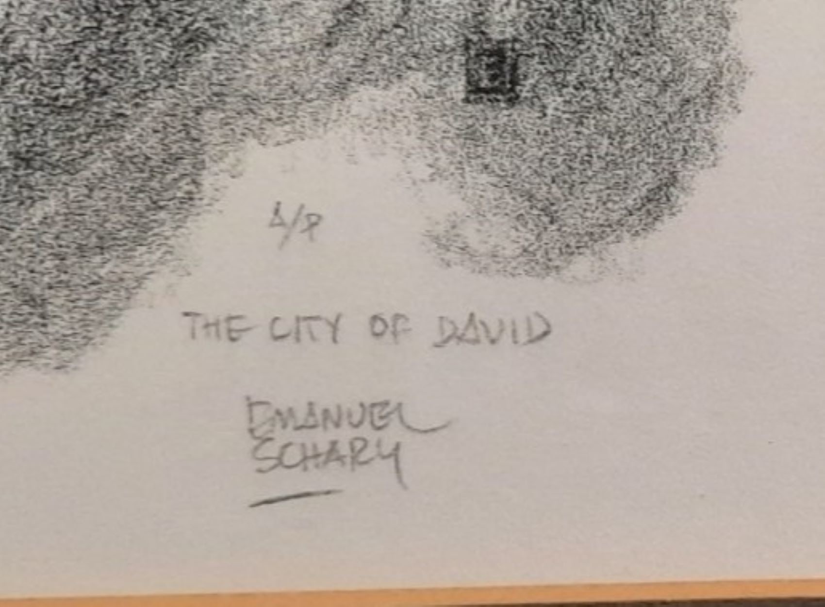 Beautiful lithograph on paper titled 'The City of David' by Emanuel Schary. Framed. The frame does have some slight damage to the corners and the protective paper on the verso has been torn and removed.