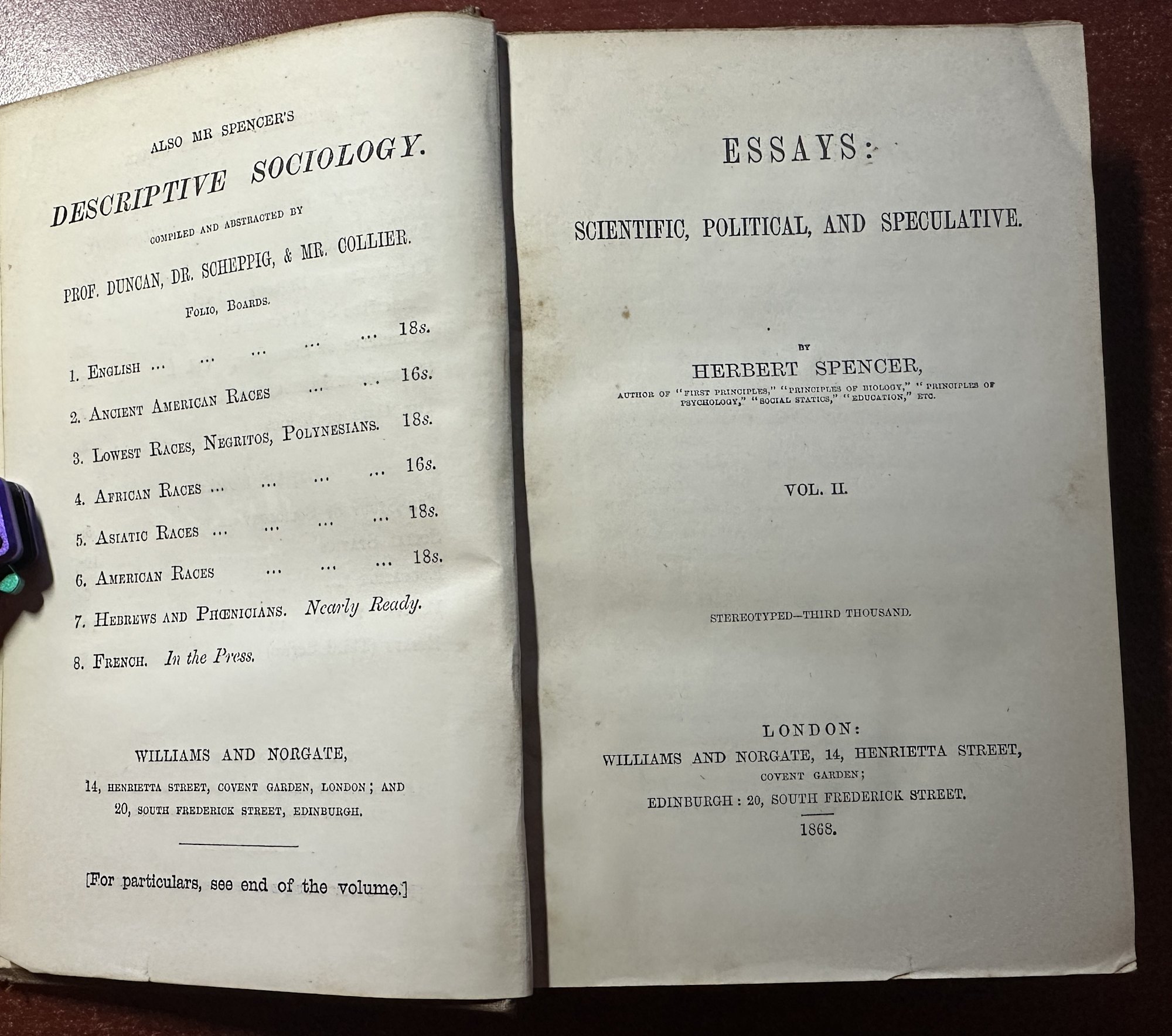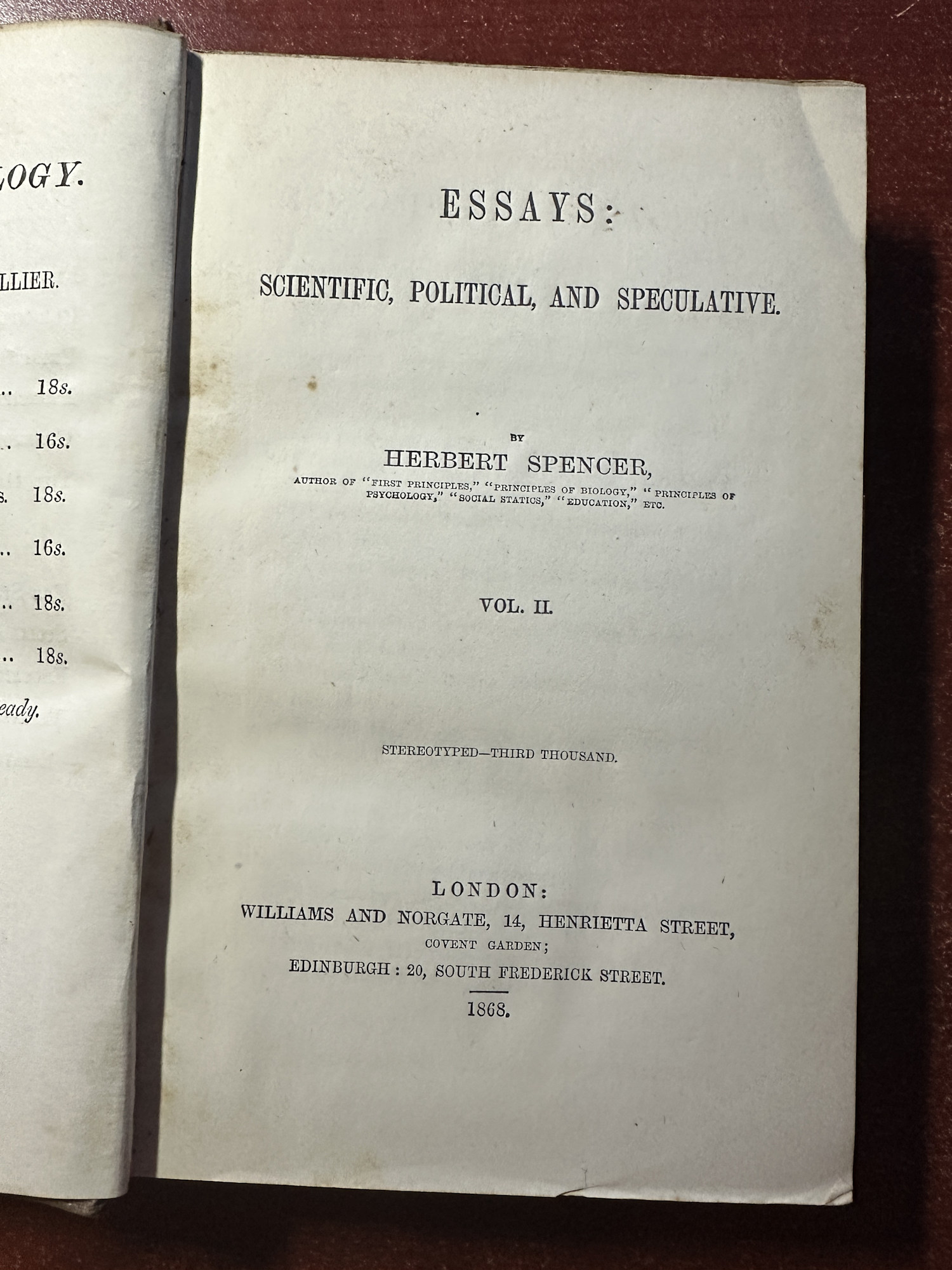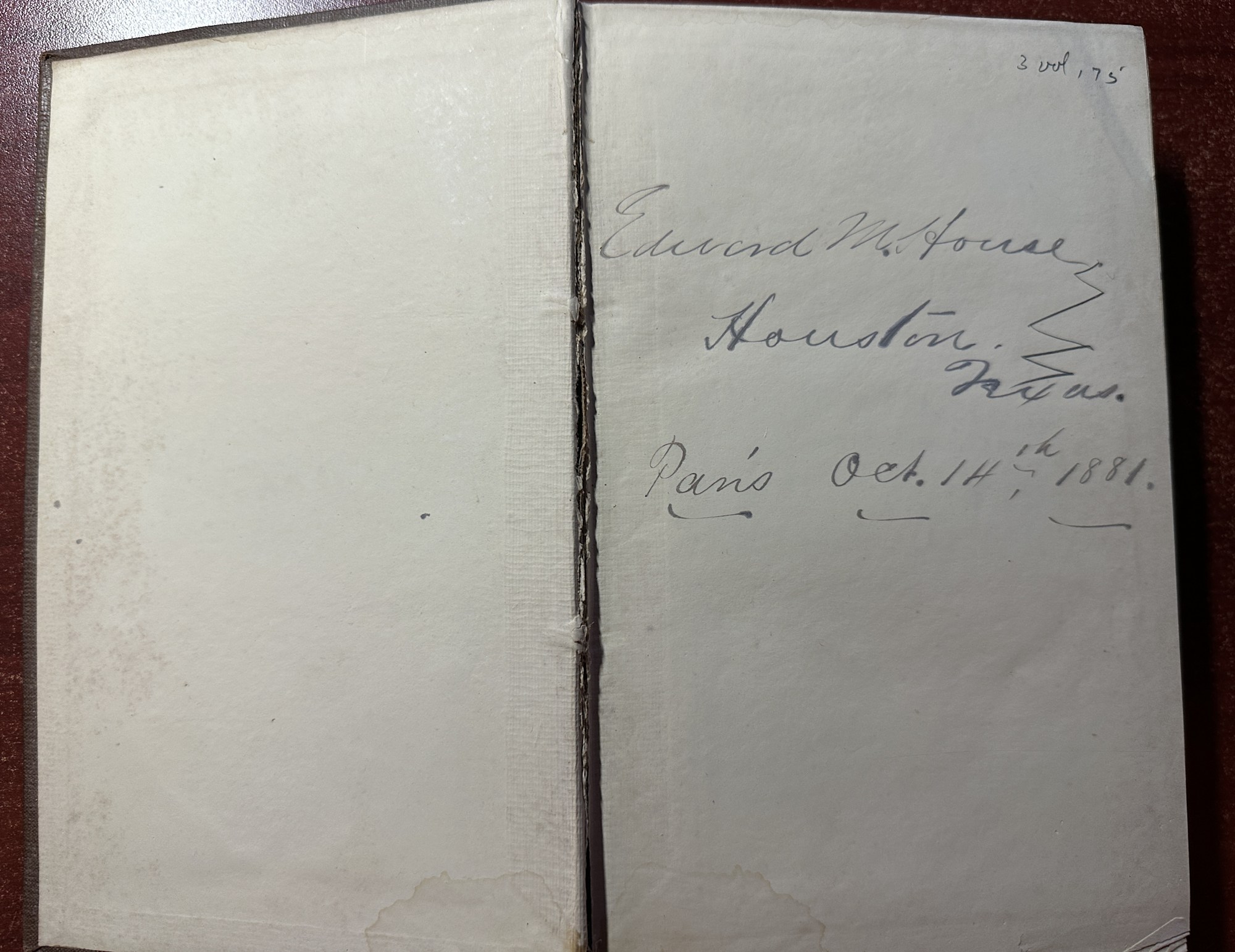 Essays: Scientific, Political, and Speculative Vol. 2 1868 published in London by Williams and Norgate. The first page contains the signature of Edward M. House Houston, Texas Paris? Oct. 14th 1881. House: (July 26, 1858 – March 28, 1938) born and raised in Houston, Texas was an American diplomat, and an adviser to President Woodrow Wilson.