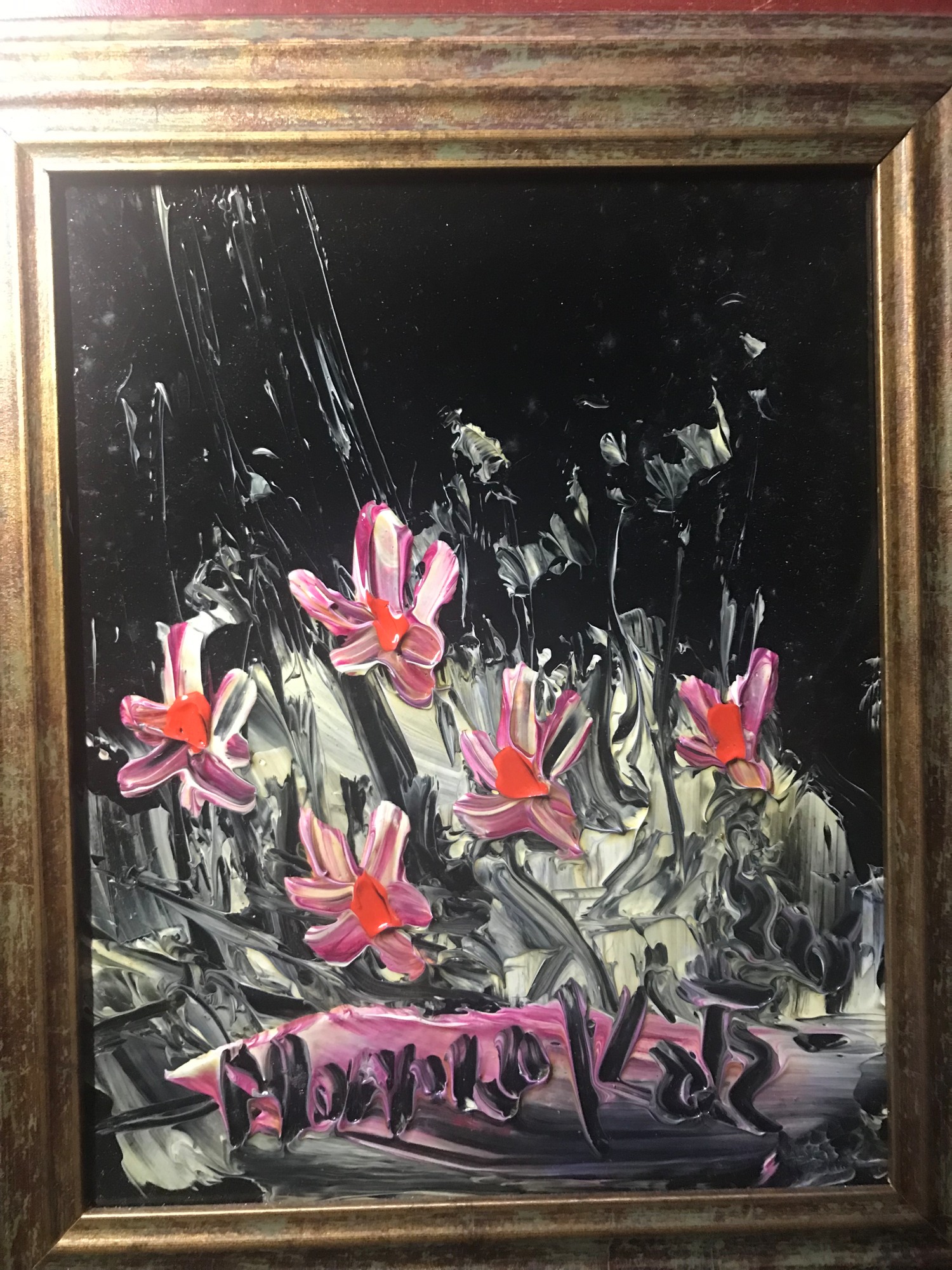'Five Flowers' is a Textured Oil Painting on Masonite by famed prolific artist Morris Katz. The painting is signed in the pigment by the artist. The piece is framed.
