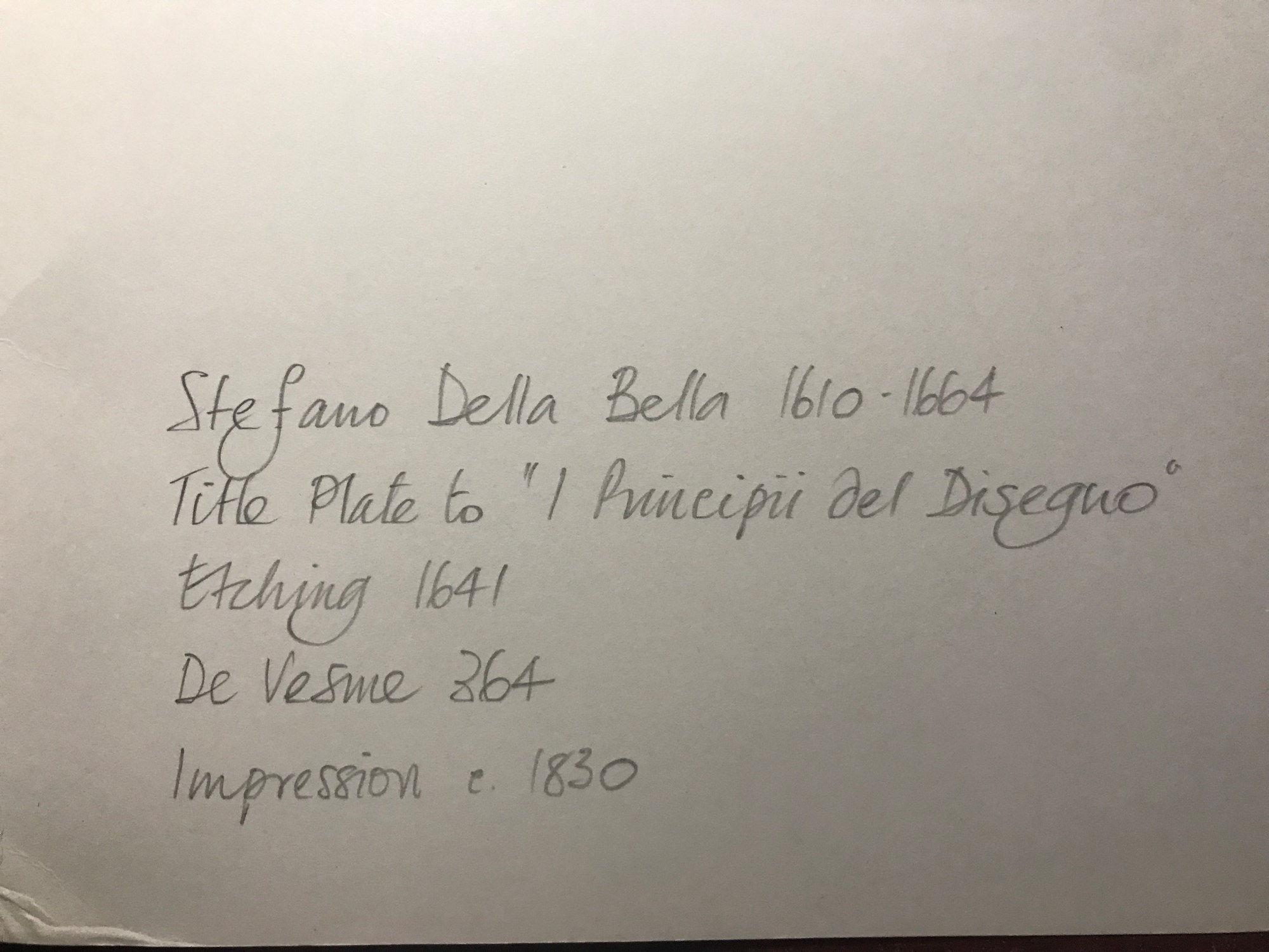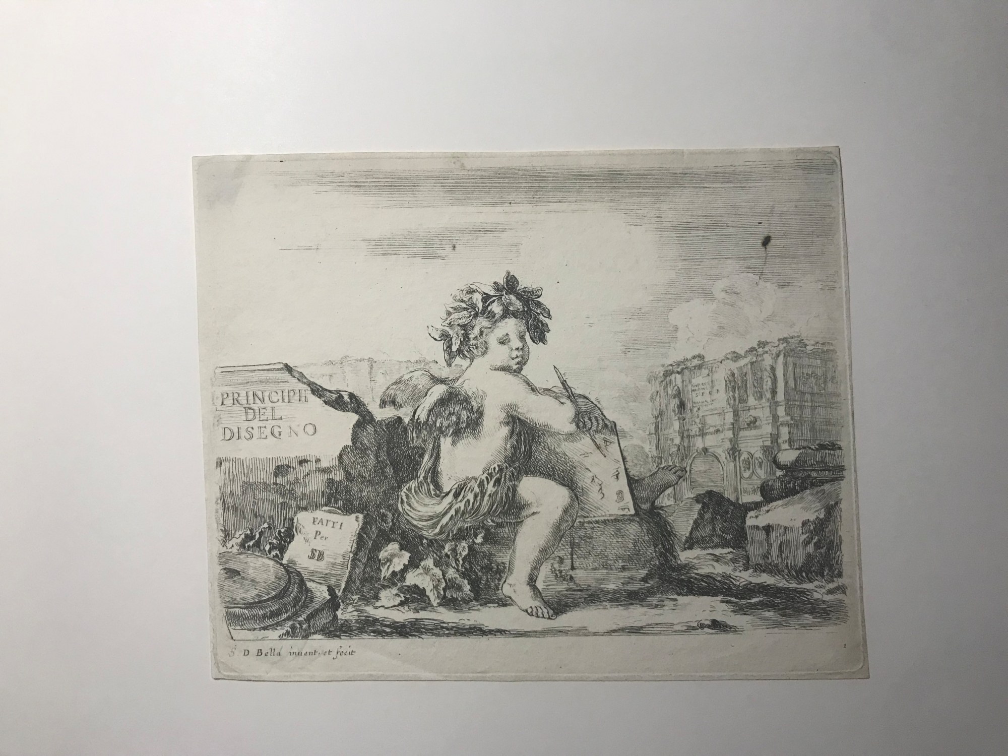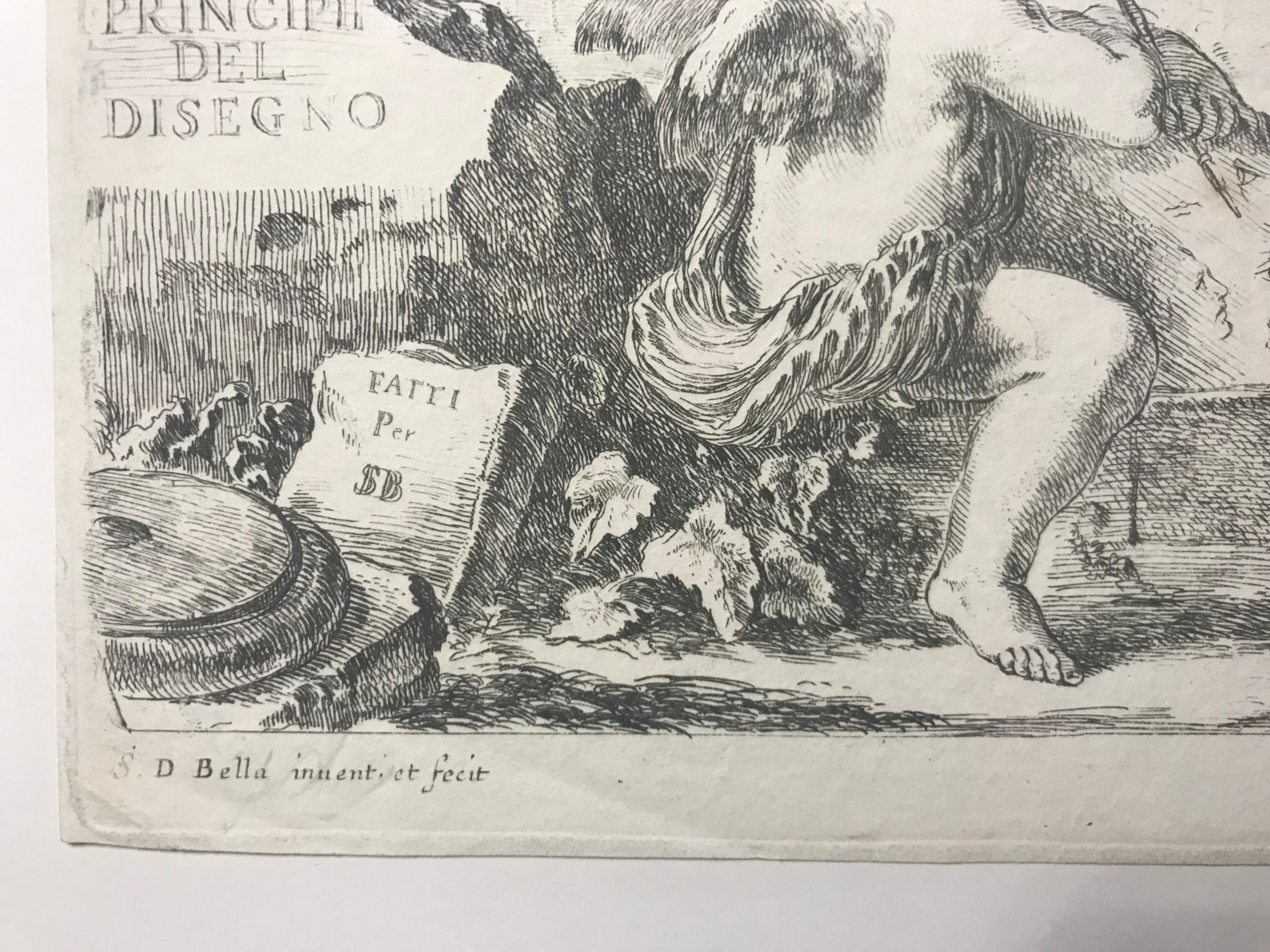 • Signature: Inscribed in plate, center l.: PRINCIPII DEL DISEGNO; below on book: FATTI Per SDB; l.l.: S.D. Bella inuent. et fecit