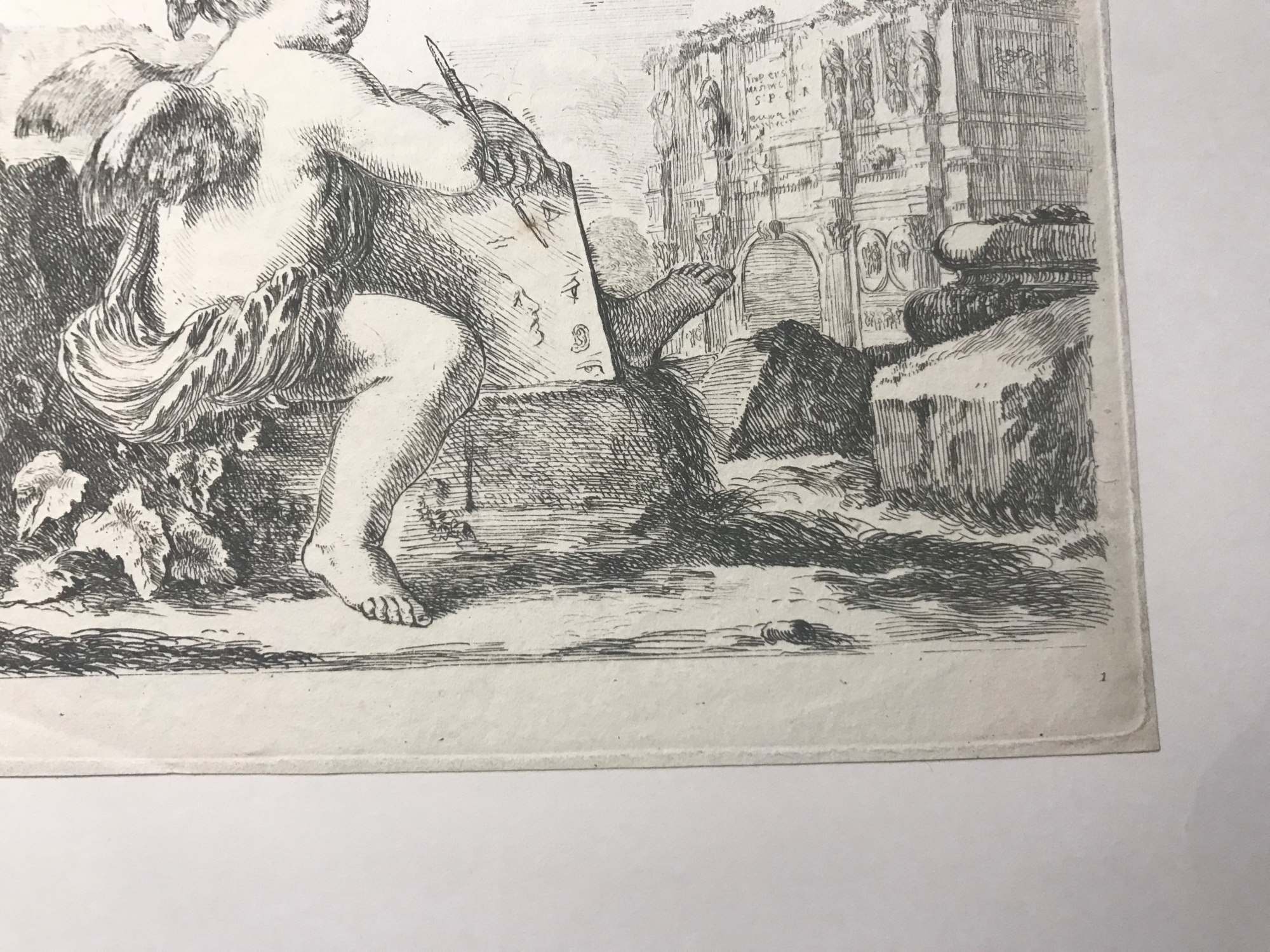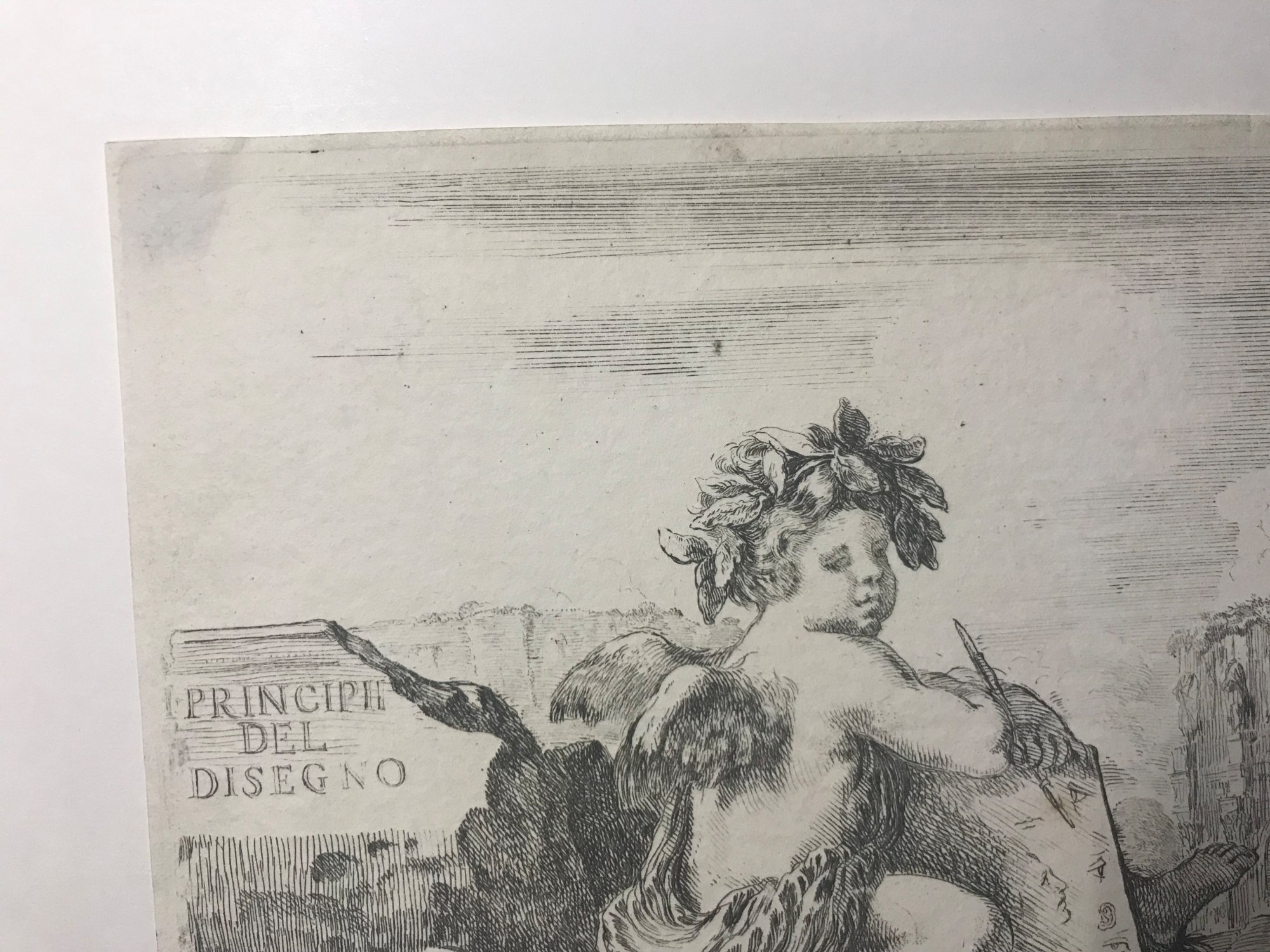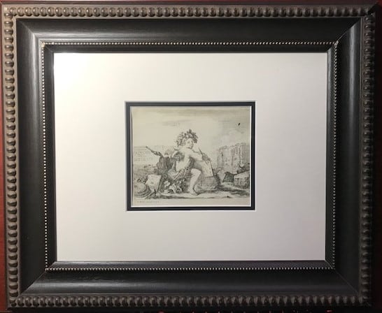 I principii del disegno, Plate I, frontispiece Putto with Drawing Instruments etching by Stefano Della Bella printed circa 1830. The watermark appears to be 'D Wilmot above 1828' Catalogue Raisonne: De Vesme 364. Piece is framed with plexi on the verso so that the watermark is visable.
