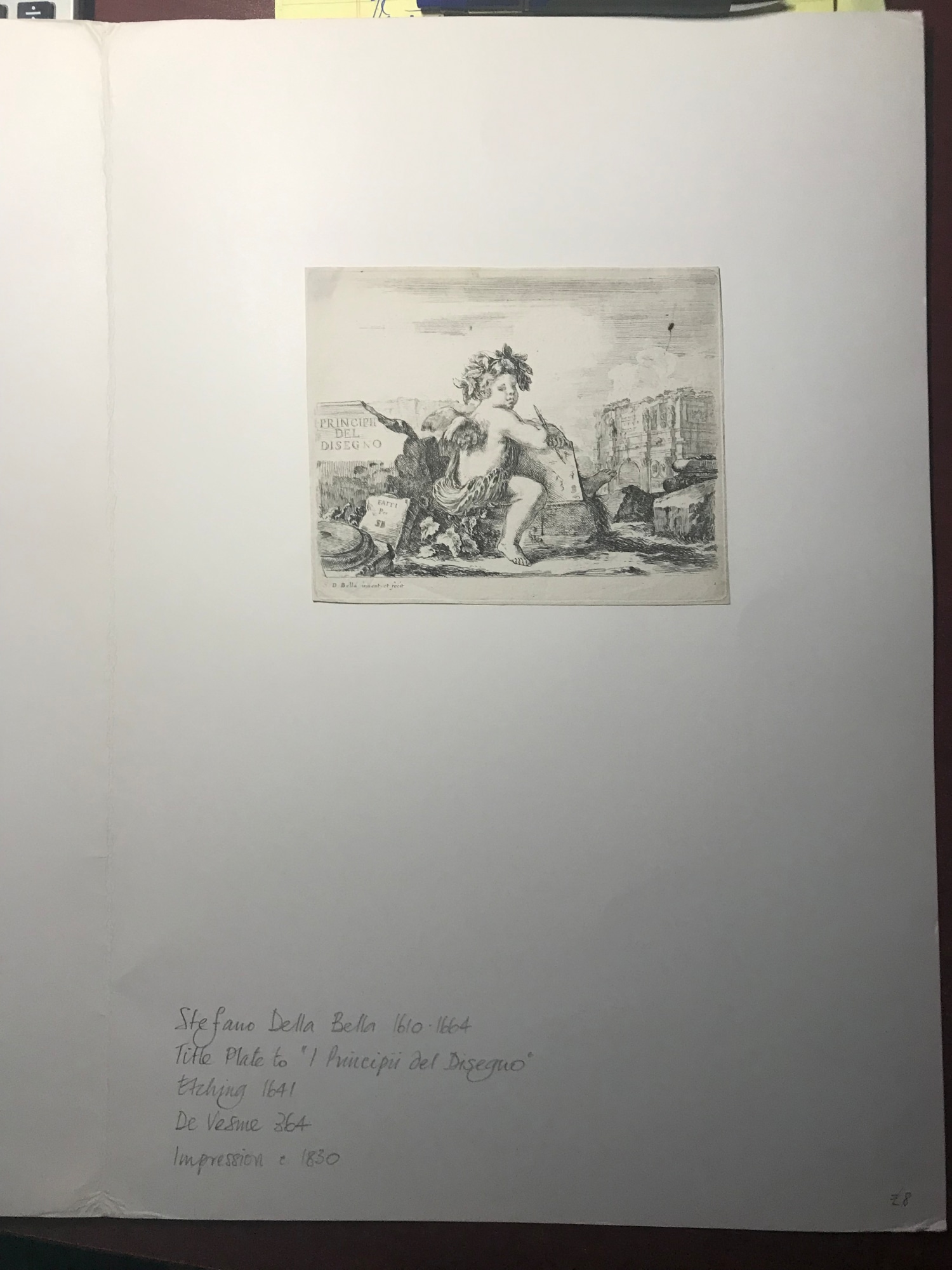 inscribed in plate, center l.: PRINCIPII DEL DISEGNO; below on book: FATTI Per SDB; l.l.: S.D. Bella inuent. et fecit