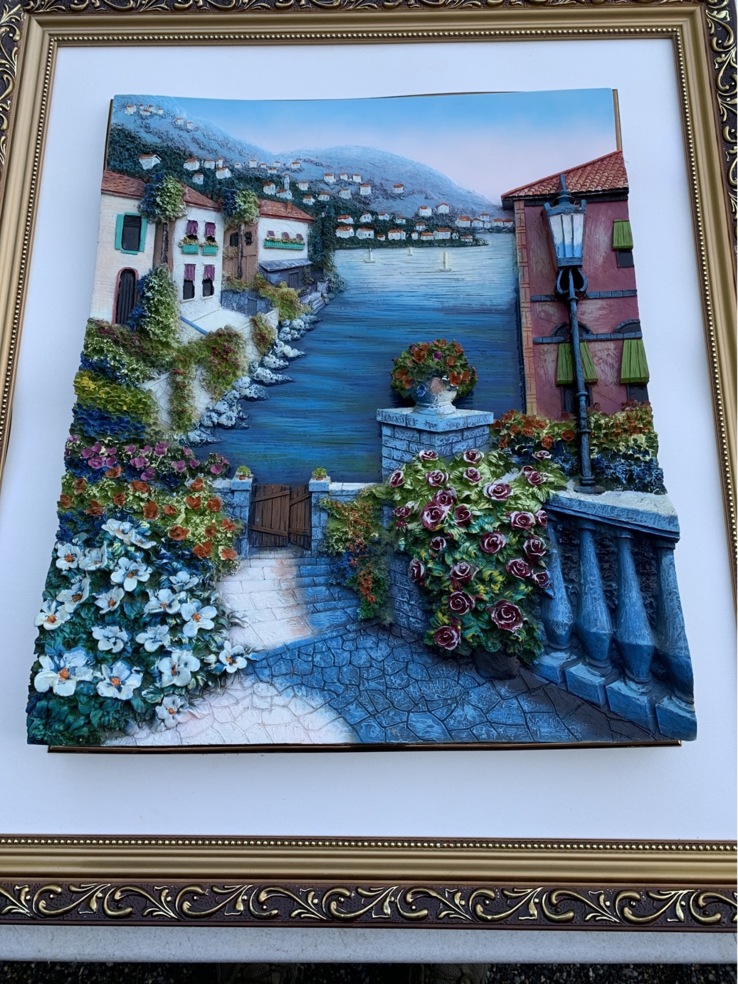 Beautiful three dimensional celluloid with beautiful coloring the Mediterranean coast. Professionally framed.