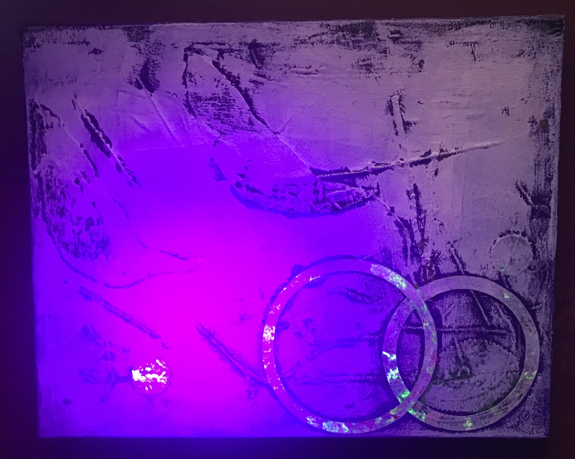 Really nice modern mixed media abstract piece on stretched canvas. The circles and 2 - 1.5" medallions fluoresces under blacklight. No apparant signature.