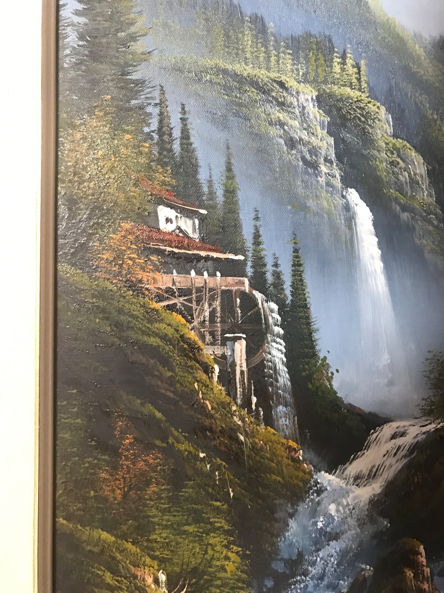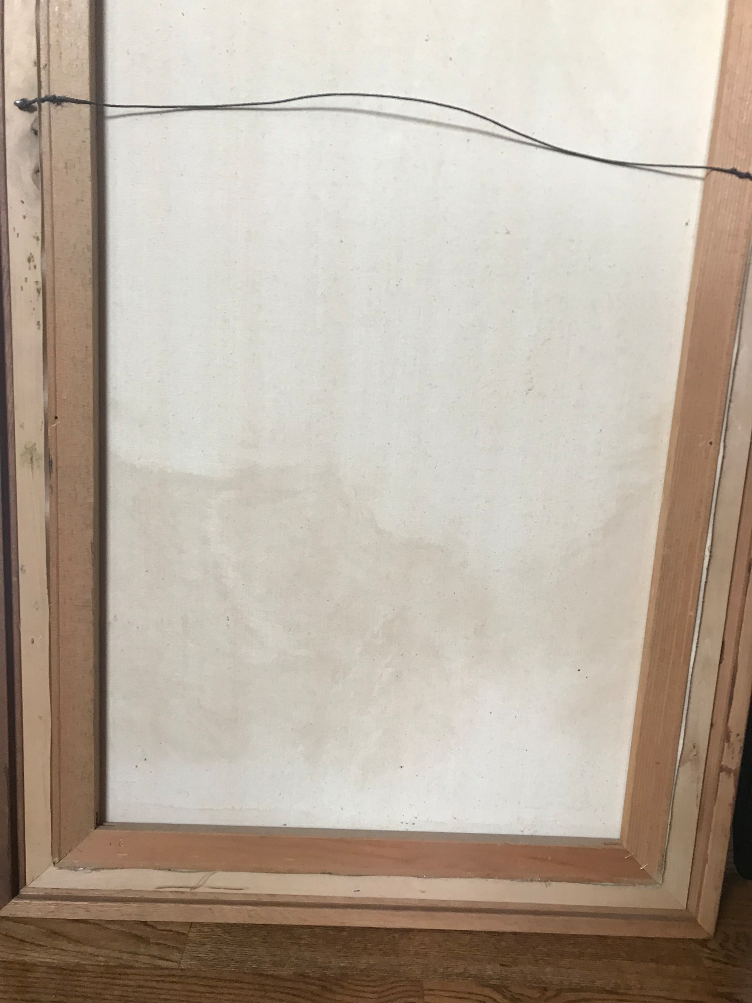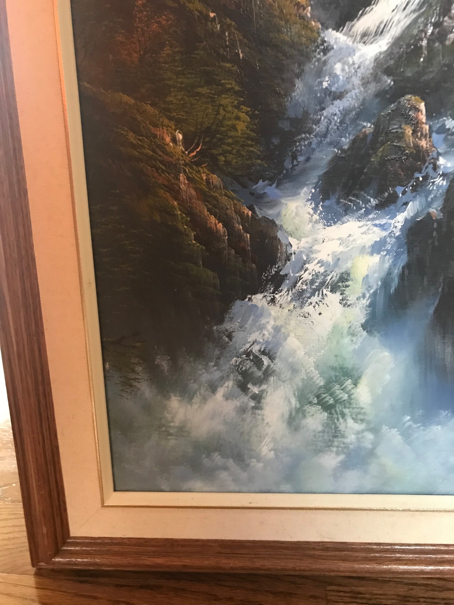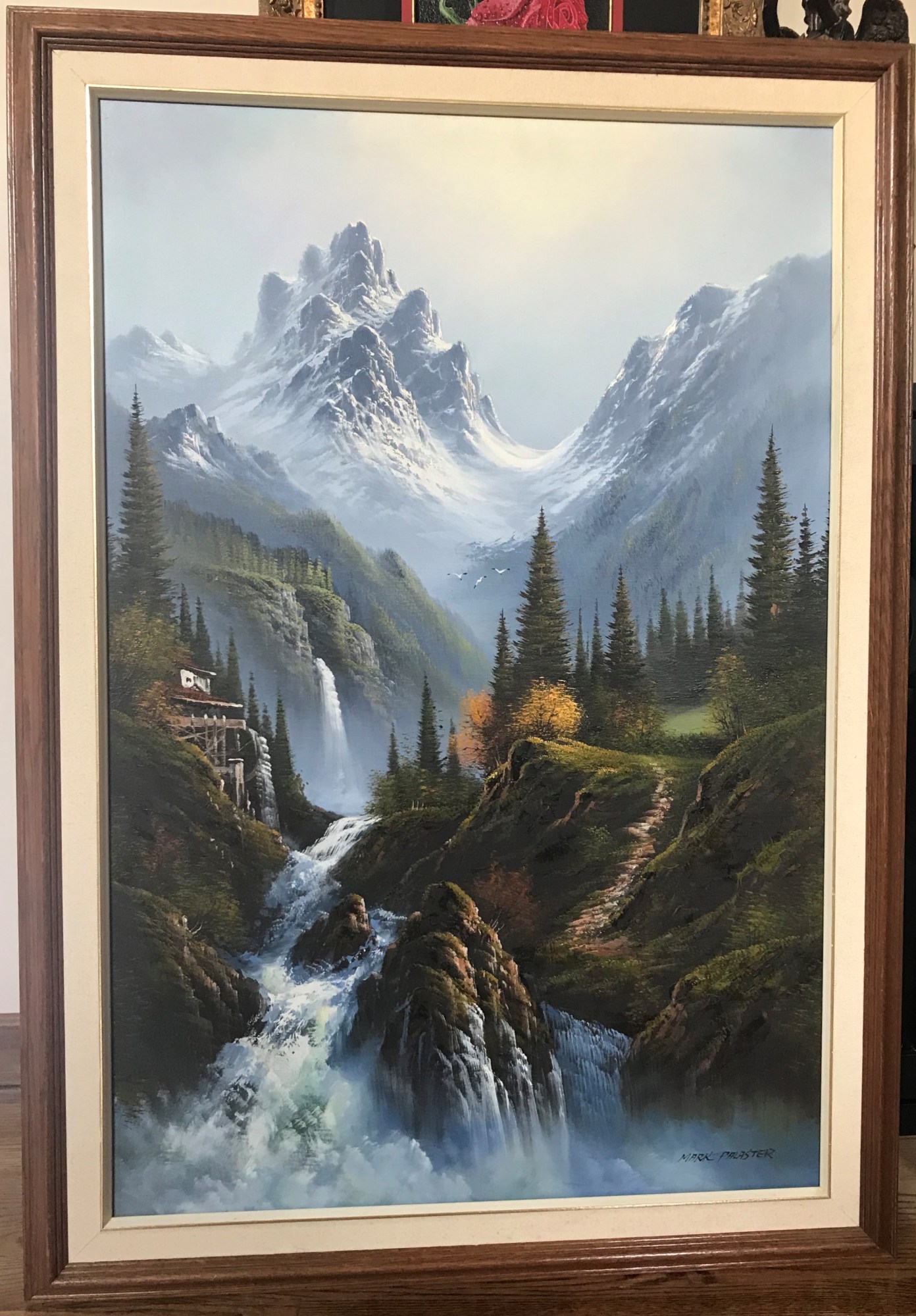 Mountainside is an original acrylic on canvas by Mark Palaster. This piece is professionally framed and ready for hanging. The art is 36" x 24", the framed size is 41" x 29". The frame is wood with an off white fillet. There is slight staining on the lower third on the verso as shown in the photo. This was present prior to my obtaining this piece. This UPS shipping cost $62.00 as of 3/28/2022.