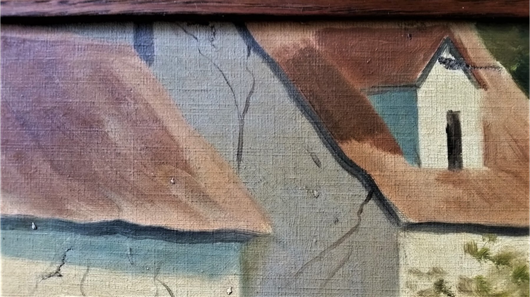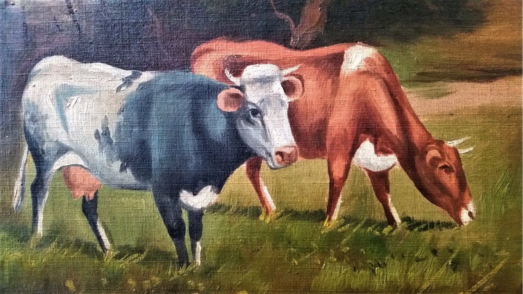 Pastoral Folk Art Farm painting with Two Cows in a mission oak frame.